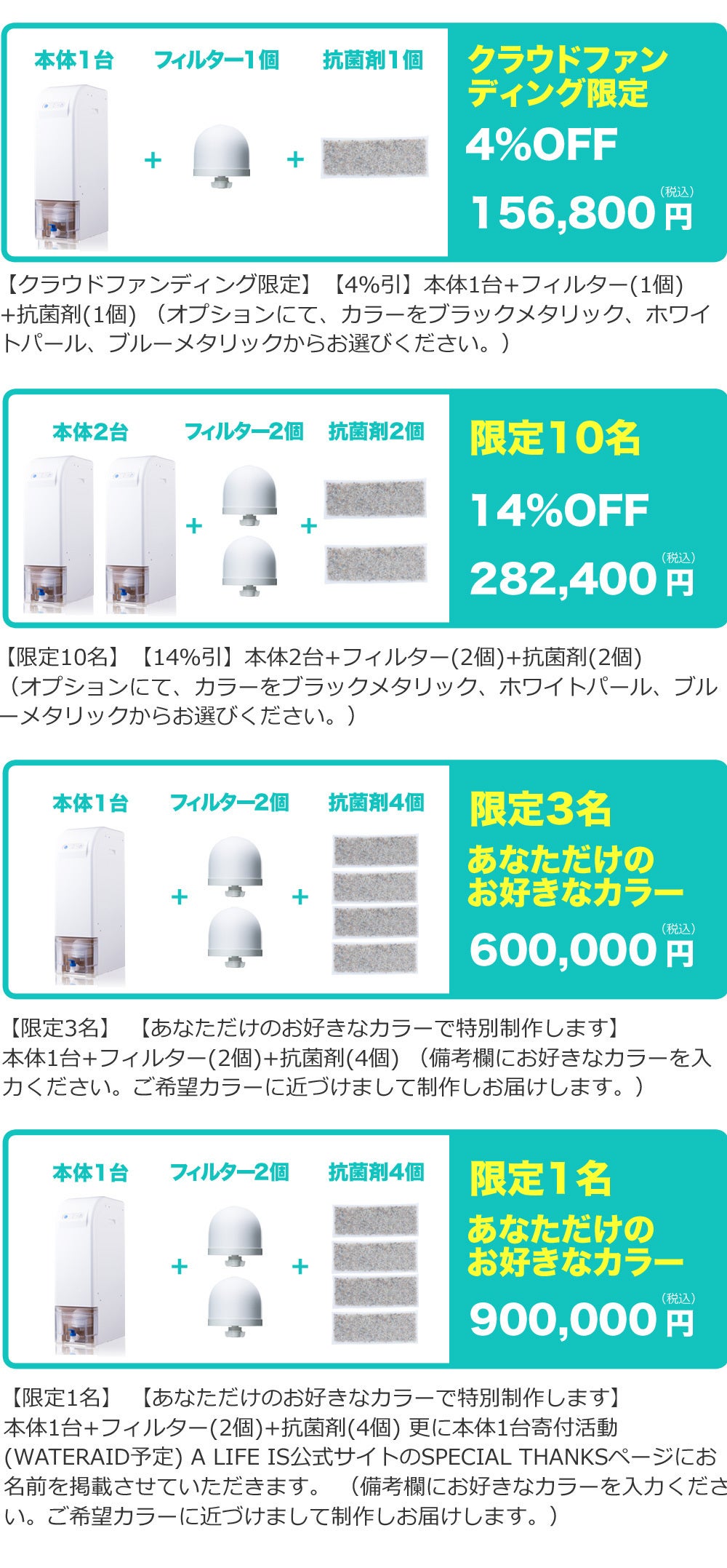 2020/06/12 22:00パトロンの皆様へ本プロジェクトにたくさんのご支援をいただきまして本当にありがとうございます。あと数時間でクラウドファンディングは終了いたします。終了後にはすぐに生産を開始致します。7月発送を目安に最短でお届け出来ますように手配を進めて参りますので、お届けまで今しばらくお待ちくださいませ。また、クラウドファンディング終了後の「泉せせらぎ」本体や消耗品のご購入、製品サポートは、A Life is(ア ライフ イズ)公式サイトにて承っております。https://www.alifeis.com/ご不明点がございましたら、なんなりとご連絡くださいませ。 A Life is プロジェクト実行者一同より もっと見る