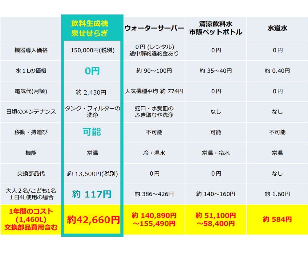 1Lあたりのランニングコスト:約29円/L(1日換算:約117円)となります。
