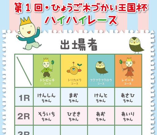 3月19日(日)実施の「第1回・ひょうご木づかい王国杯 ハイハイレース」の出場者一覧となります。当日はオリジナルゼッケンを作ってお待ちしております。13:30からの受付開始となります。当日の飛び入り参加も可能ですよ!