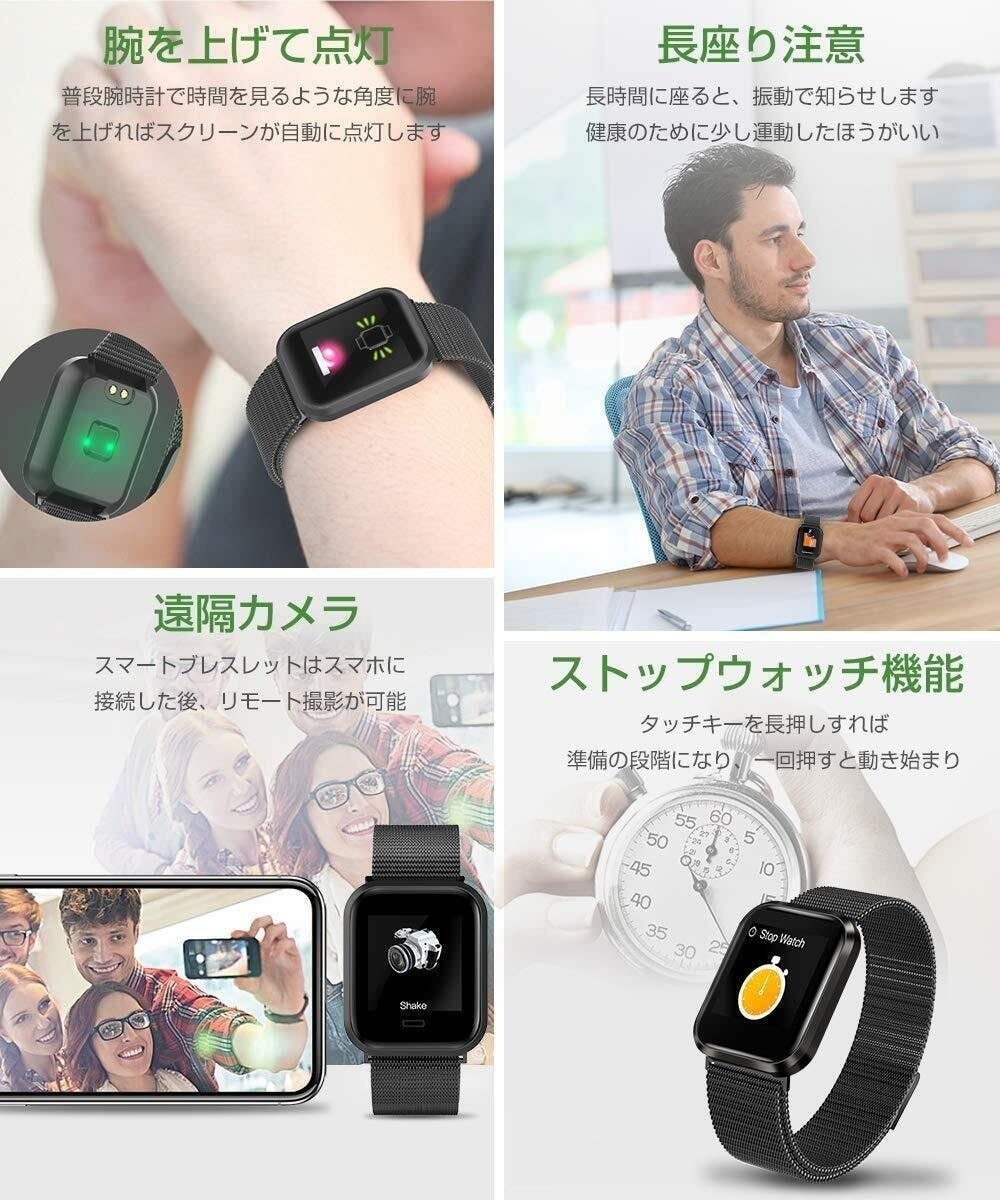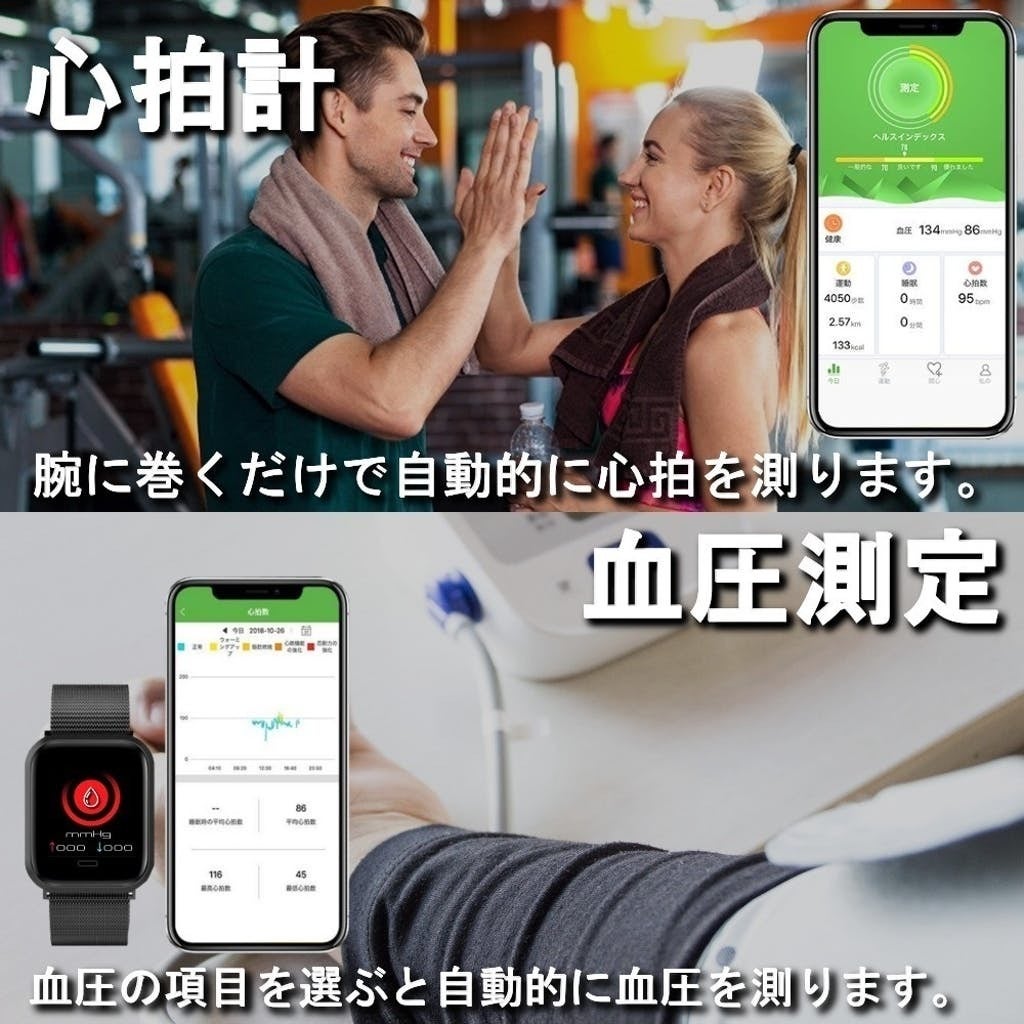 時計、歩数計、カロリー計算、距離の測定、心拍数、血圧計、