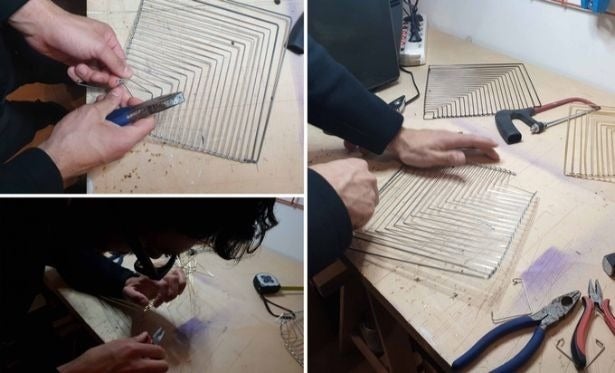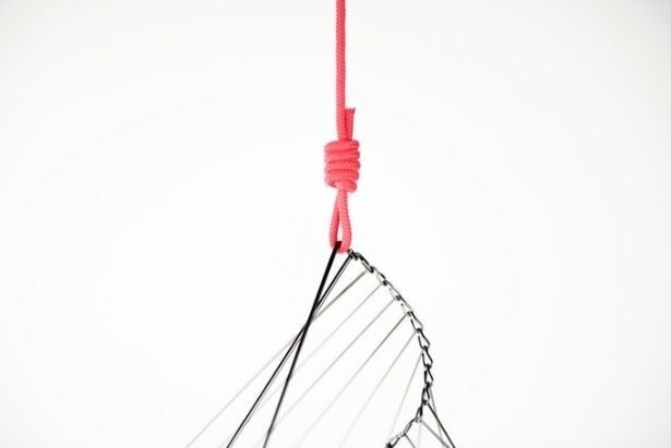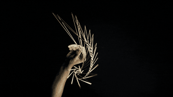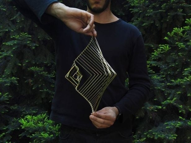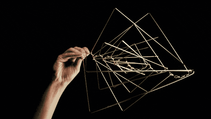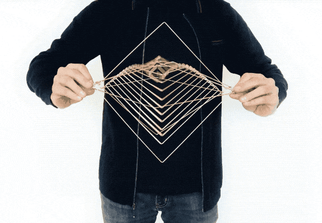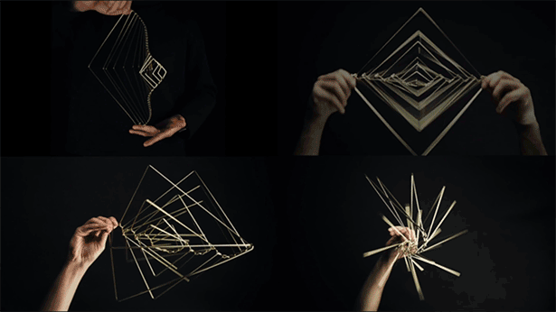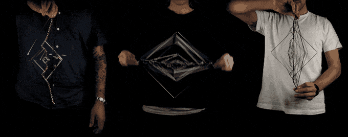 回転する力や角度によって、芸術的に変形する21本の接続された金属フレームで構成されています。