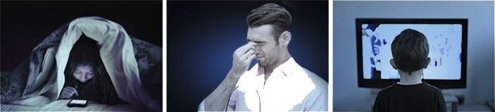 459 ~ 484ナノメートル : 夜間に青い光を見るとメラトニンの生成をさまたげ、睡眠障害をまねきます。