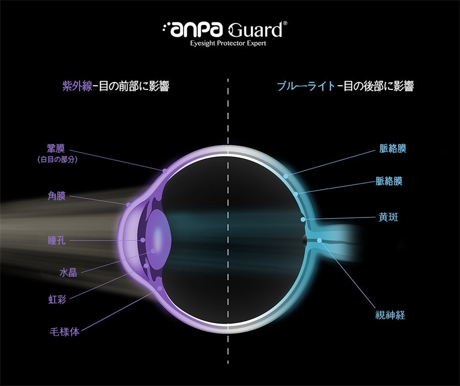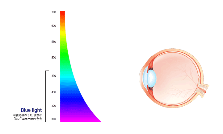 この波長は高ければ高いほど目の疲れを増加させ、生活リズムを崩します。就寝前にスマホを見ていると寝つきが悪くなるのはこのためです。より問題視されているのは可視光線内のエネルギーがもつ最も強い光で、水晶体または角膜に吸収されないまま網膜に到達し、視力の低下、視細胞の損傷、黄斑変性などにつながる危険性があるということです。