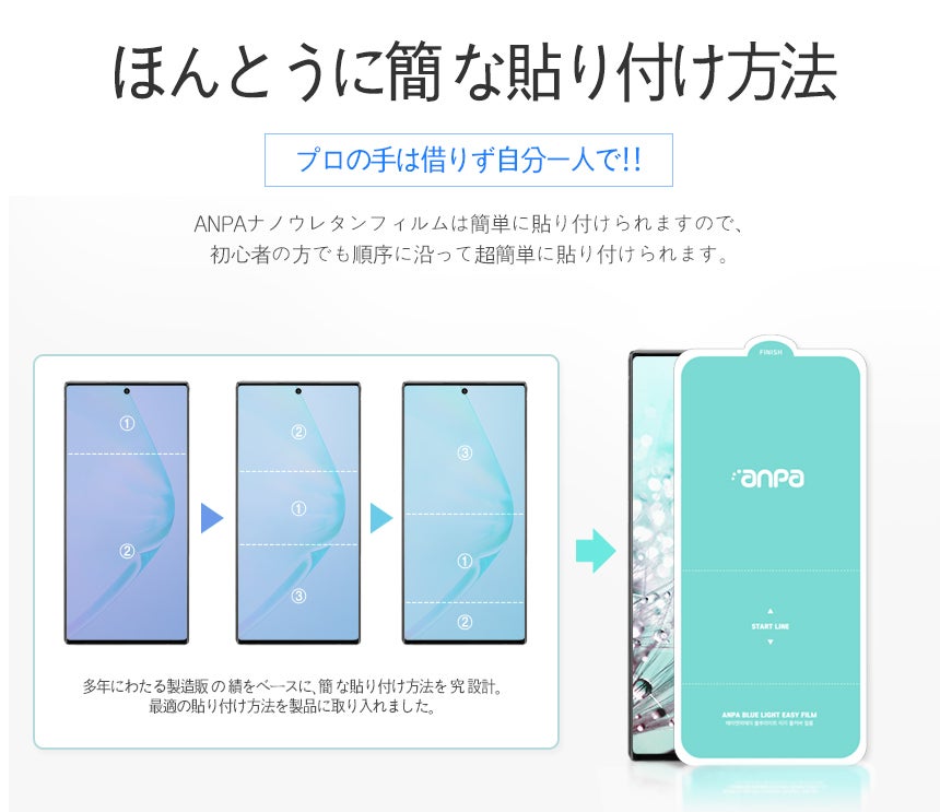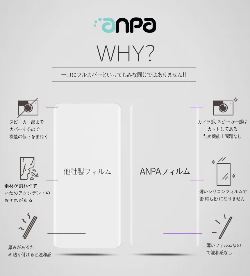 - ANPAブルーライトガードは、スマホのエッジ部まで貼り付けられる設計ですので、浮き上がりの発生しない小気味のいいフィルム貼りが可能です。