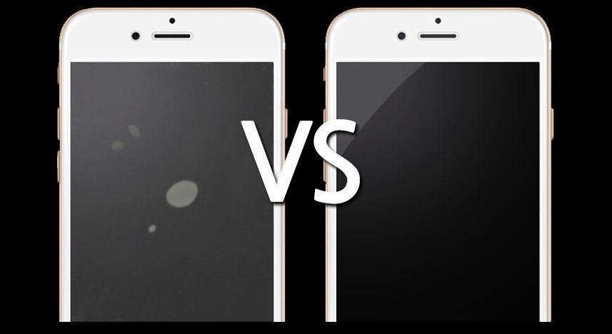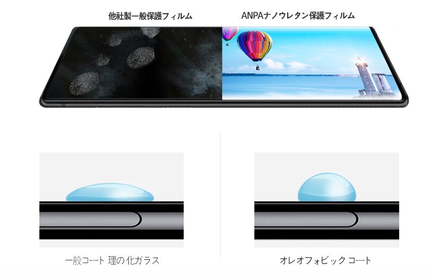 一般フィルムの場合、水滴は弱々しく飛び散っていますが、オレオフォビック・コート処理のフィルムの場合、水滴は拡散せずにとどまっているようすが目でわかり、指紋やしみなどが付着しても軽く拭き取れます。オレオフォビック・コート技術の採用でよりクリアに、より長くお使いいただけます。