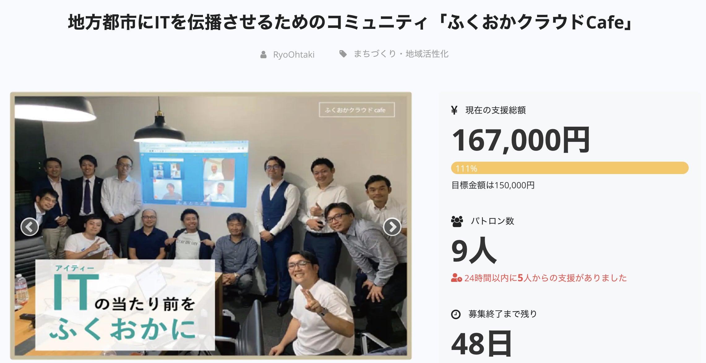 2020/01/05 08:17パドロンの皆様、パドロン予定の皆様こんにちは、3rdコンサルティング株式会社の大瀧です。1月5日時点で9名のパドロン様、トータルご支援金額167,000円で目標の111%を達成することができました。ご支援いただきありがとうございます。今後についてご報告をいたします。2月20日まではこのプロジェクト続けさせていただきます。理由は一人でも多くふくおかクラウドCafeの取り組みを知っていただき、全国でふくおかクラウドCafeをしたい!と思っております。引き続きこのプロジェクトのシェアなど、ご支援お願い申し上げます。 もっと見る