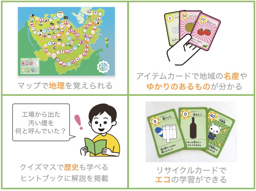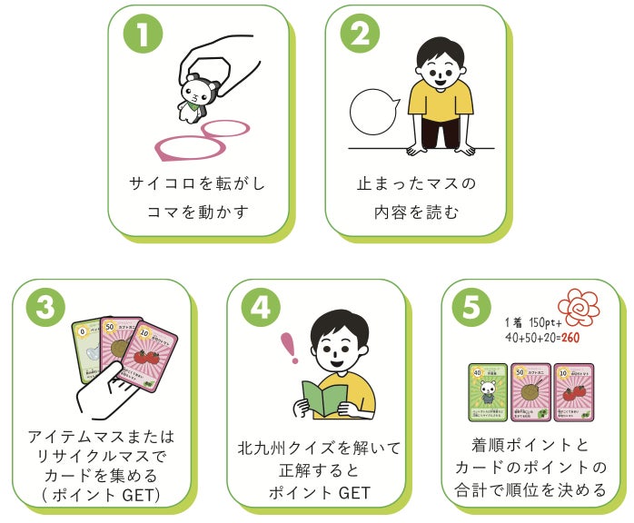 北九州すごろくは、サイコロを転がしてコマを動かすだけでなく、道中で名産品のアイテムカードやゴミ拾いをして再資源化ができるリサイクルカード、北九州クイズに答えるクイズマスがあります。