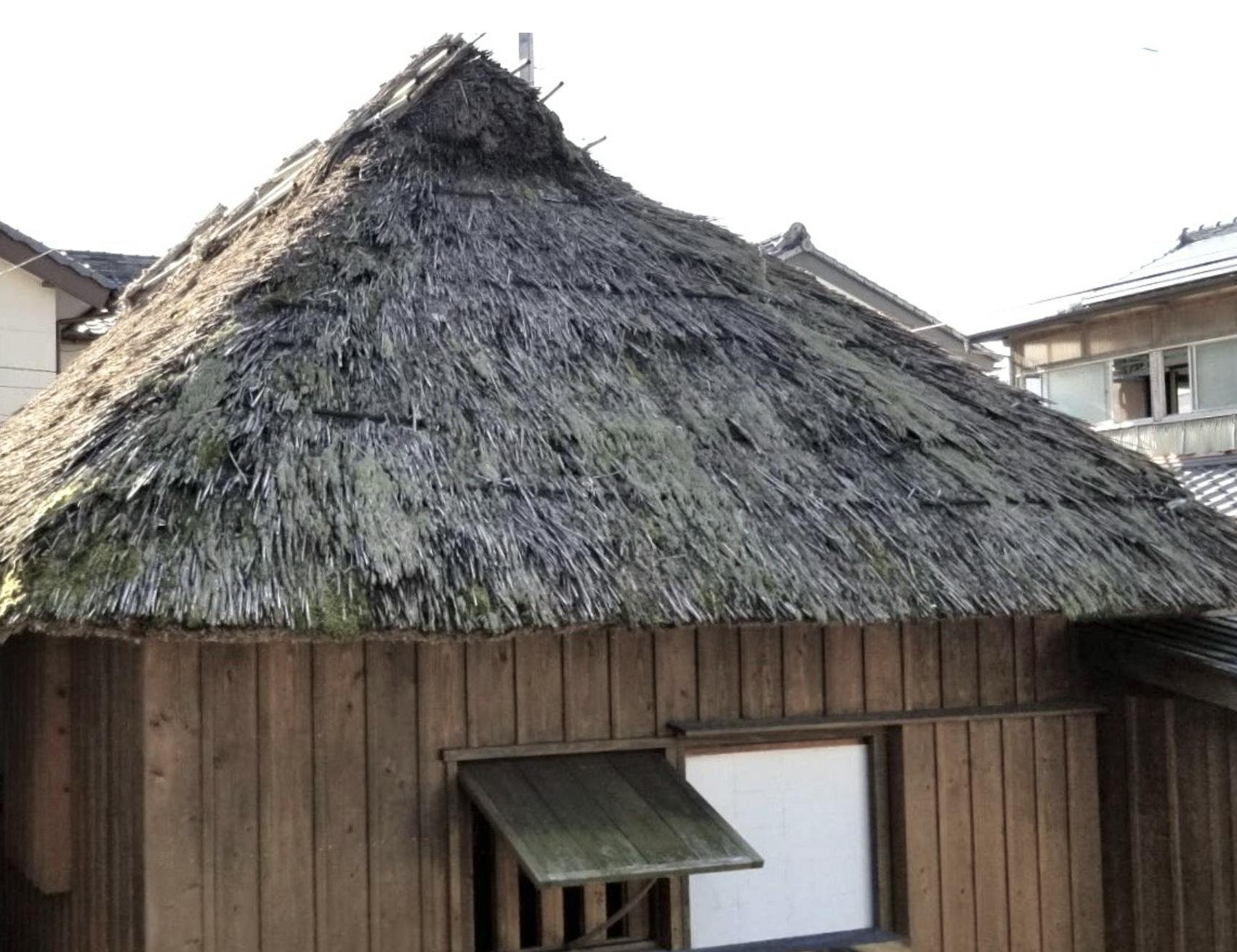 「かやぶき屋根」という作りなのですが、主に雨水の影響により、骨組みが見えるほど侵食されています。