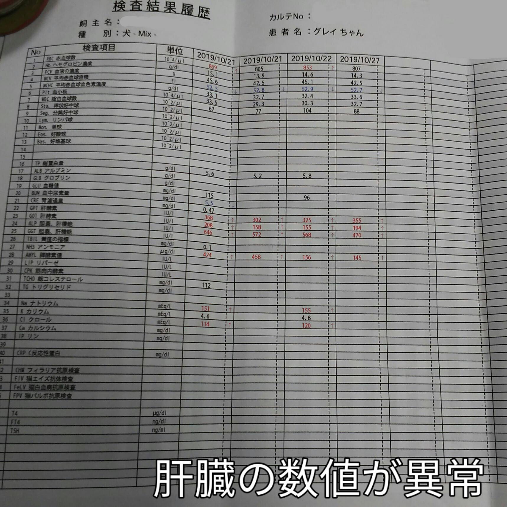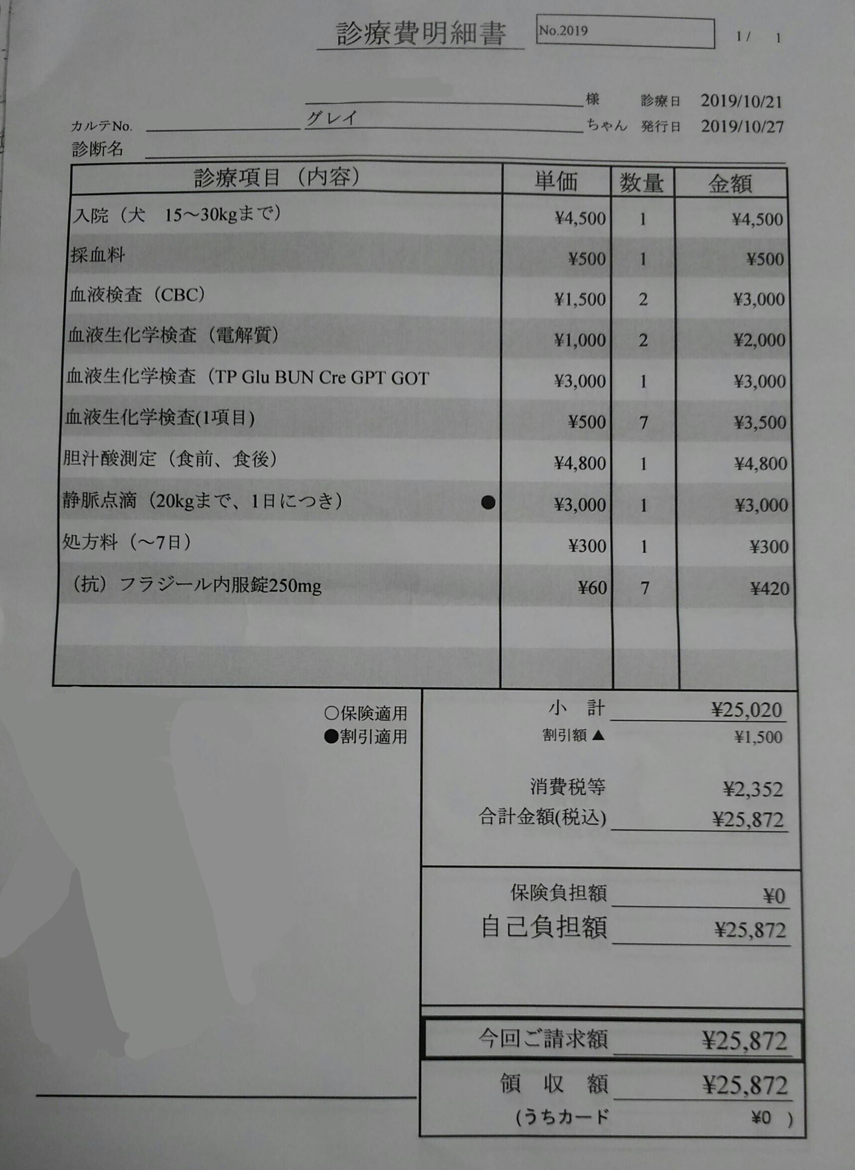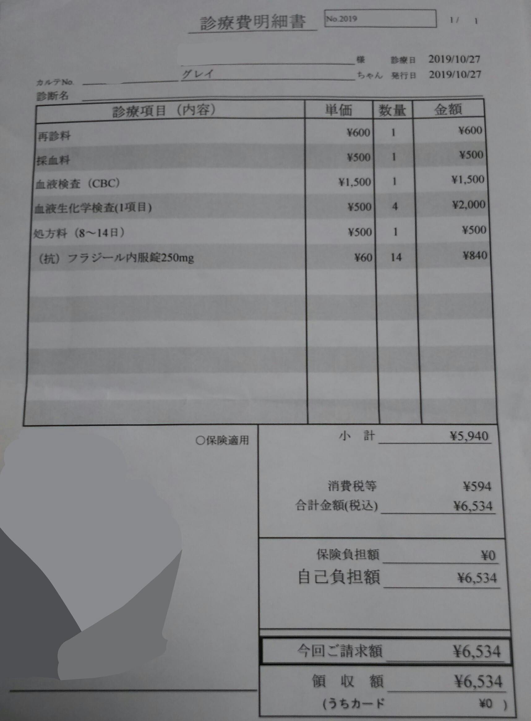 しばらく様子をみていましたが、2019年10月21日明らかに様子がおかしく、ふらつきや食欲不振がみられたため病院へ。22日まで入院することになります。