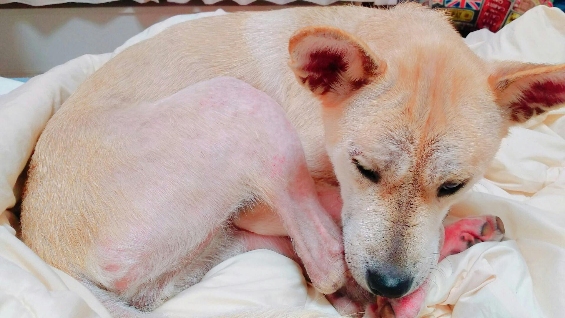 やっぱり足が赤くって、毛も所々抜け落ちています。痛痒そう……。