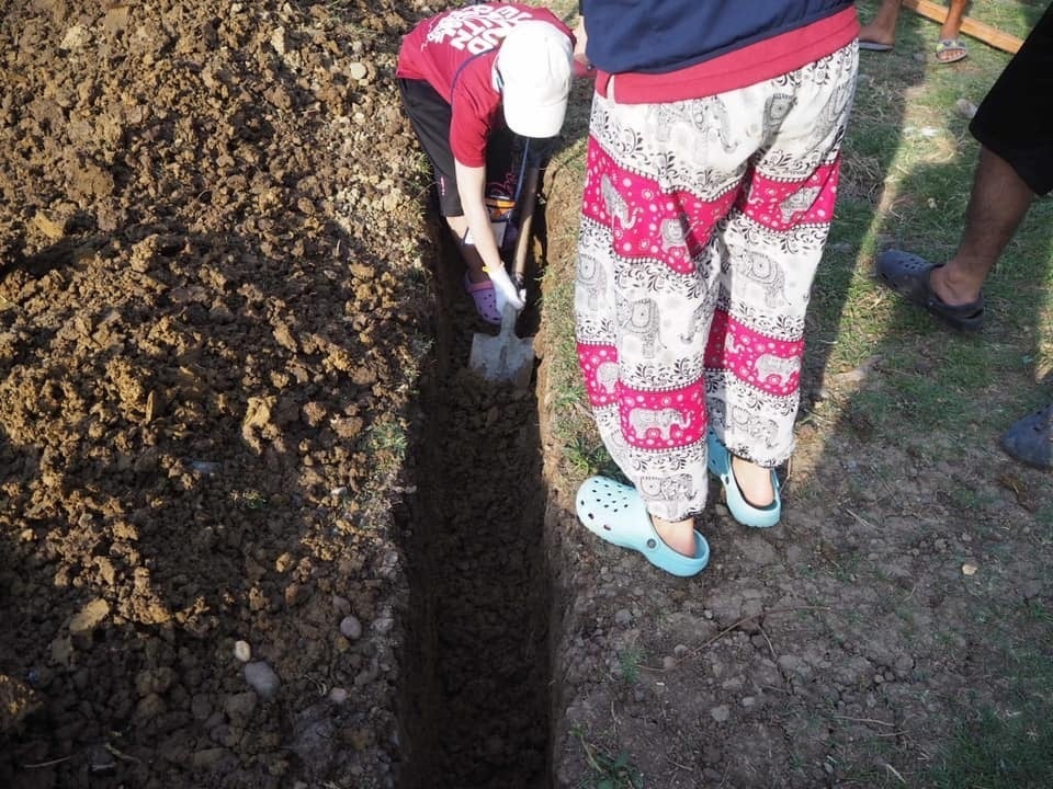 教室の土台となる鉄骨を入れるために、溝を掘っていく作業