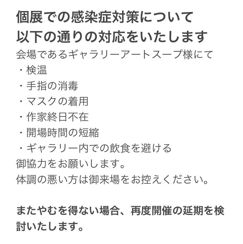 現状ギャラリーアートスープ内での飲食そのものがあまり無いところなので、延期する予定はありませんが、個展について感染症対策をお願いします。