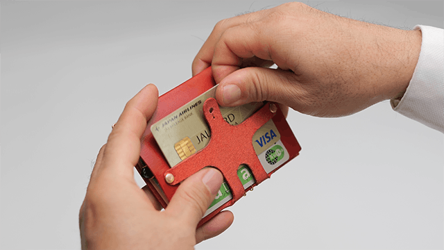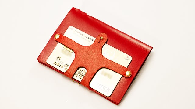 ・レザー製カバーとオリジナルクリップをつけ、紙幣も同時に持ち歩けるウォレット型に改良。
