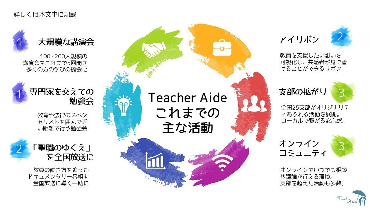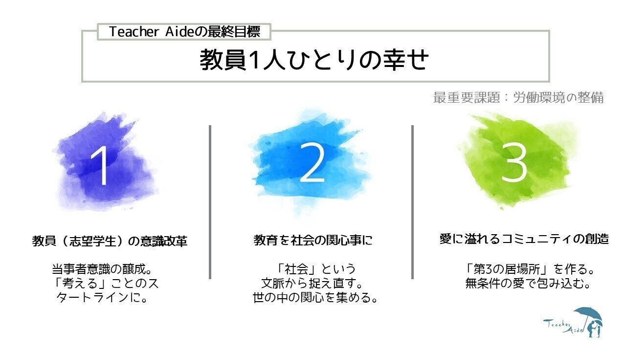 Teacher Aide は、「教員1人ひとりを幸せにする」を実現するために活動している団体です。