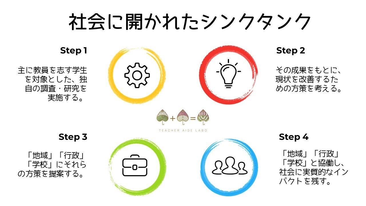 Teacher Aide Labo は、「社会に拓かれたシンクタンク」を標榜するラボであり、「学生ネットワーク」「学生独自の観点」「社会との協働」という3つの特徴を持っています!