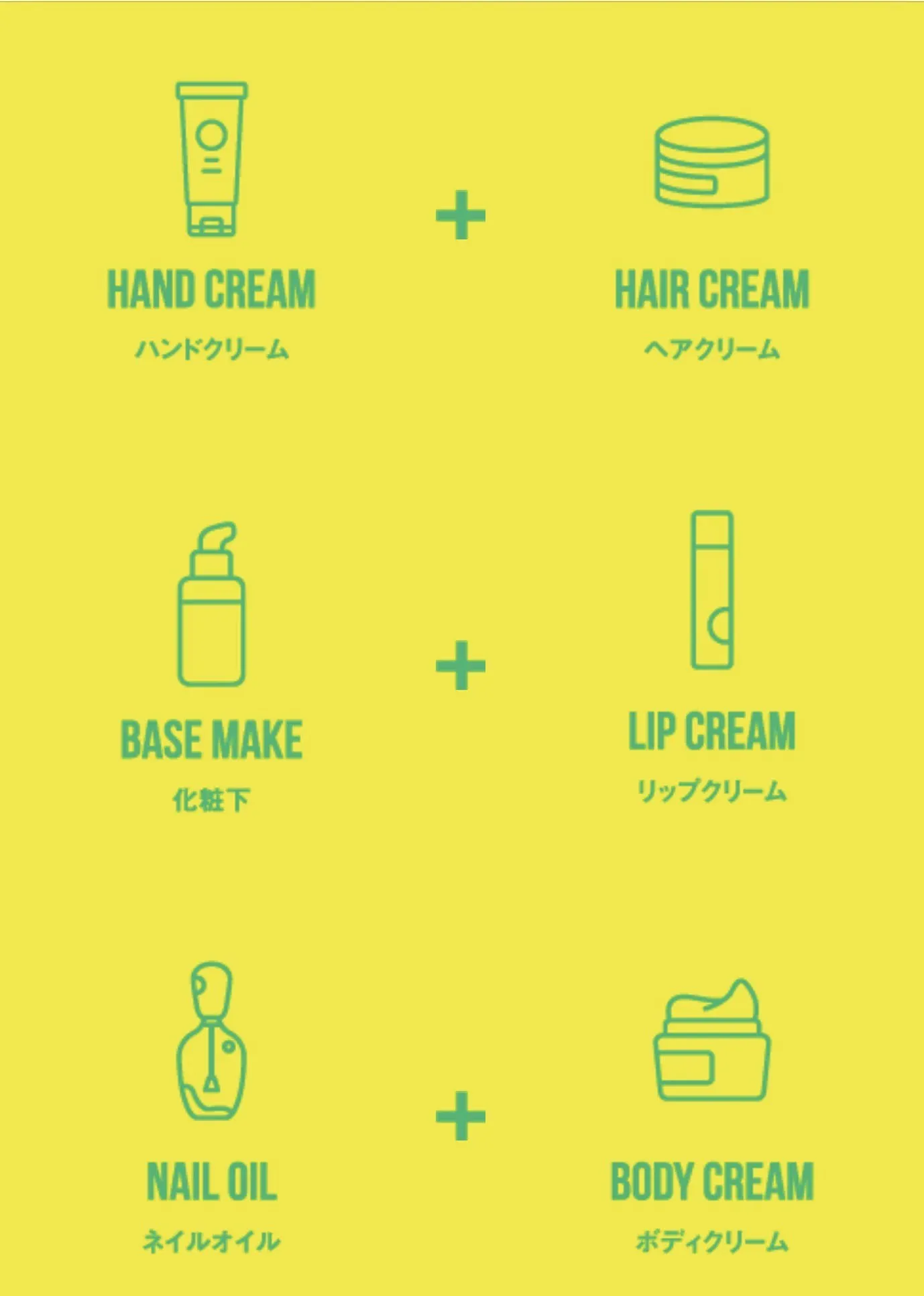 使用可能箇所:唇、眉、目元、肌、髪、ネイル、ひじ、ひざ、かかと、化粧下、おしり、背中