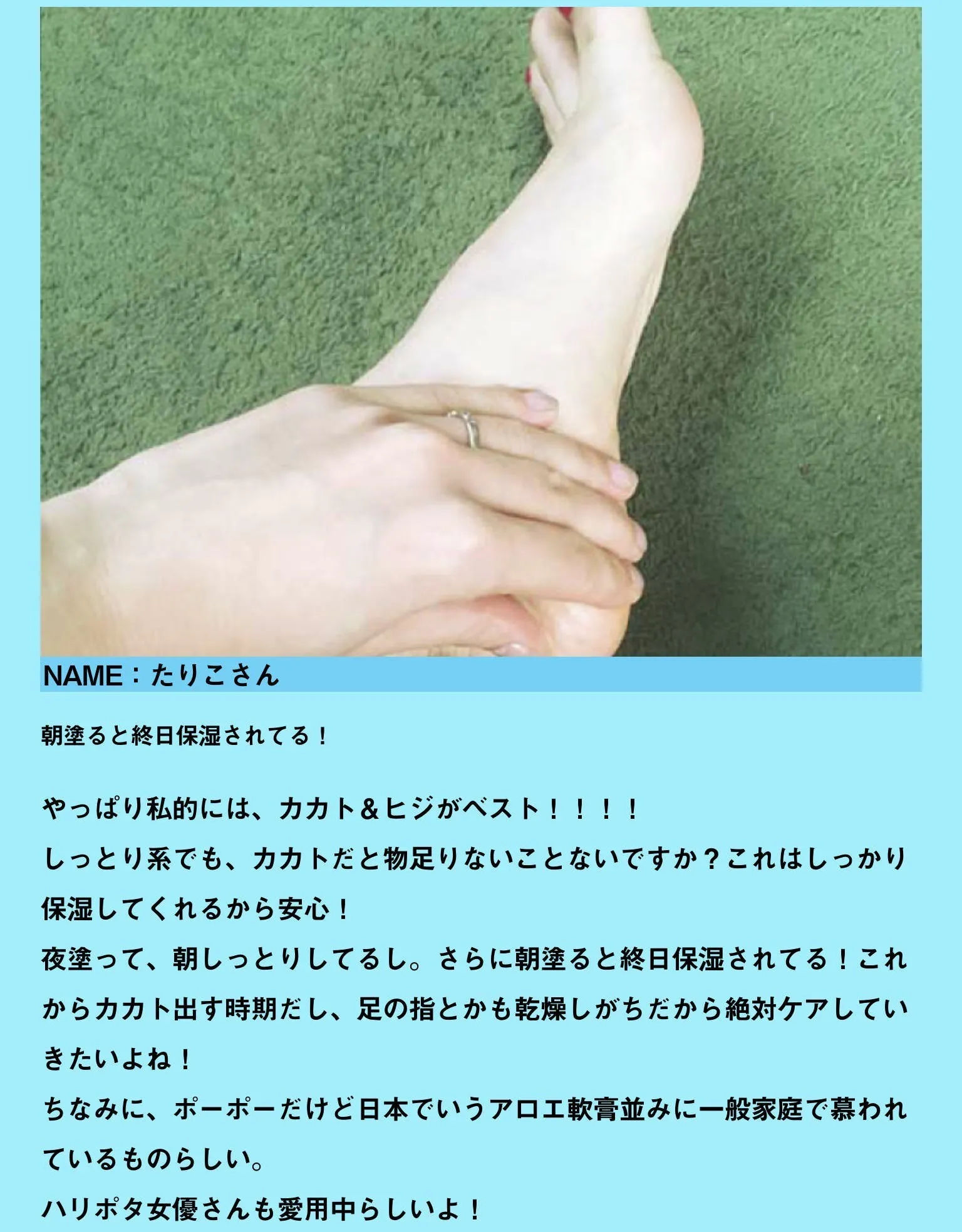 ◯お客様の声:「やっぱり、私的には、カカト&ヒジがベスト!!しっかり保湿してくれるから安心!」