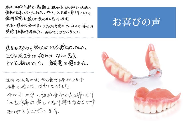 一貫して入れ歯治療に向き合う中で、たくさんの嬉しいお声も頂いてきました。