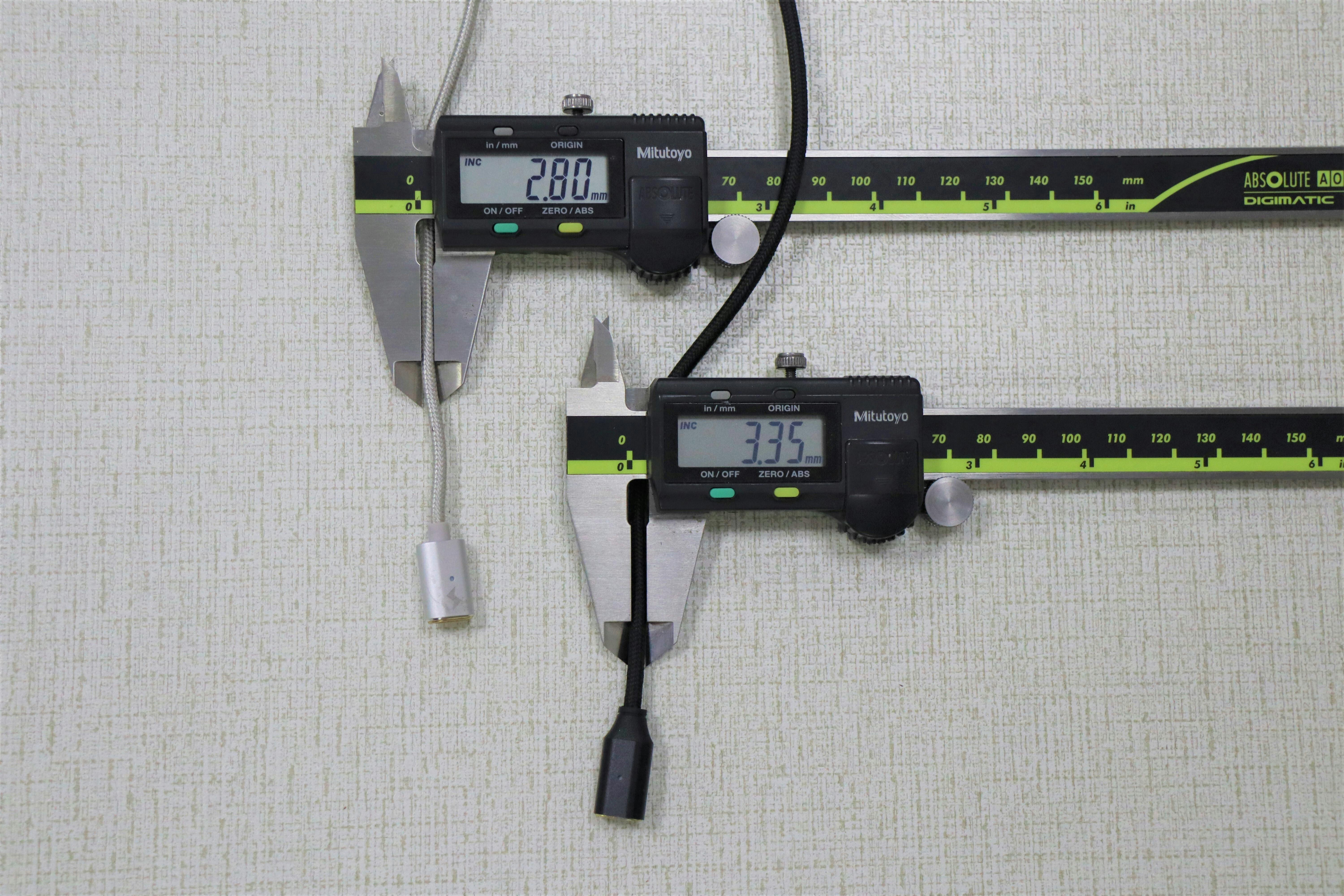 弊社では、より良い製品を作るために改良を重ねてまいりました。今回最新のUNOケーブルは、擦れたり断線しないように改良されたモデルです。断線しやすい場所でも、耐久性があります。ご覧いただくと、UNOケーブル(右側)がどれほど太いかお分かり頂けると思います。このため、ほつれにも強く、ケーブルの寿命も延びたため、保証を10年間つけることができました。