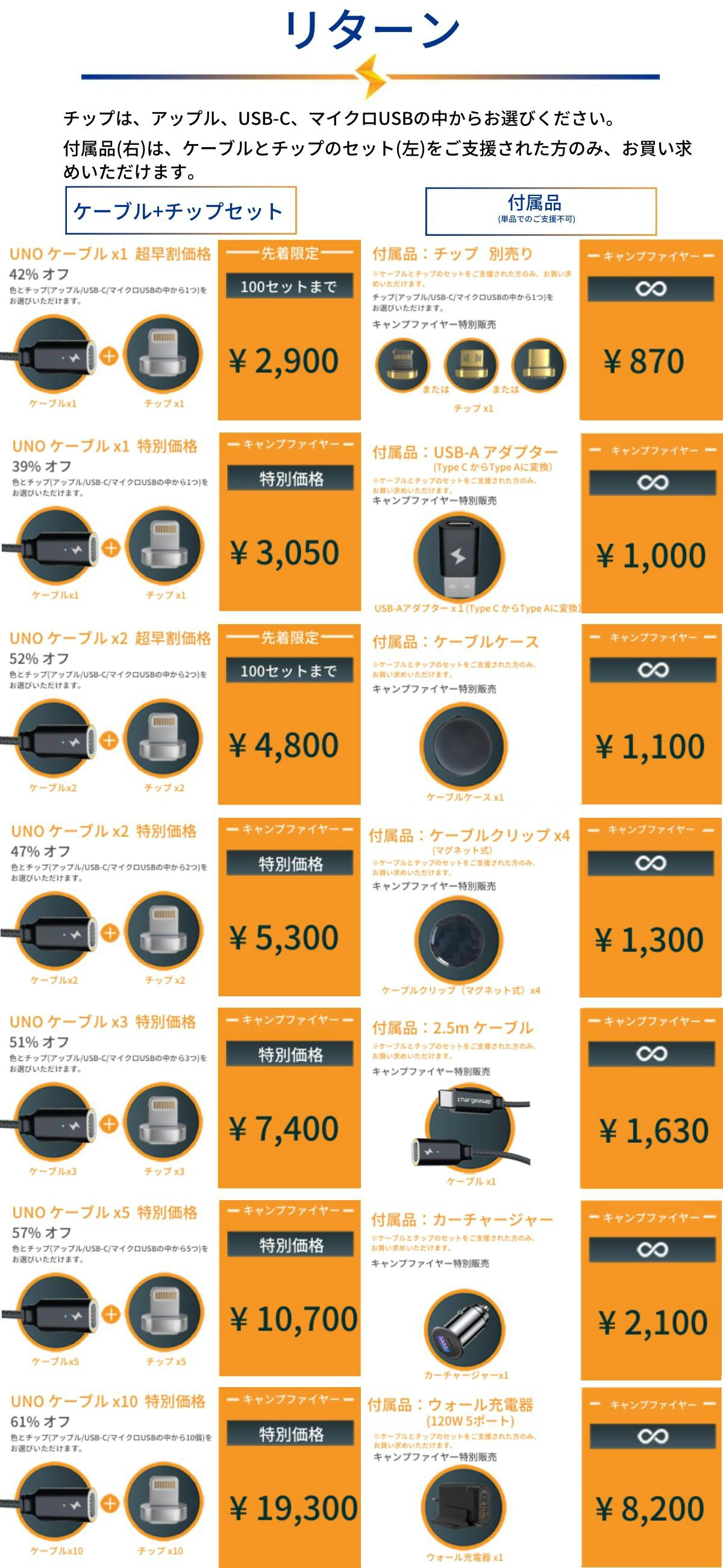 そして、今回のキャンプファイヤーでのキャンペーンでは、初めて、USB-C ウォール充電器とカーチャージャーを販売いたします。これらの充電器では、高出力のデバイスを同時に充電できます。そして、生活の中でUNOケーブルを使用しやすいように、ケーブルの最大出力もサポートしております。