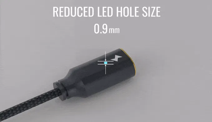 以前の製品で、お客様から、LEDを小さくしてほしいという声をいただいたので、今までより40%(1mmから0.6mm)にまで小さくしました。これにより、夜に迷惑していた光の影響が少なくなります。この最先端のUNOケーブルは、電源につながっていれば、LEDライトが常にオンになるため夜間でも見つけやすくなっております。