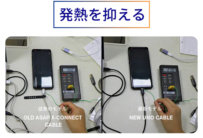 お客様からケーブルの発熱を抑えて欲しいとのご意見もいただきました。そのため、より効率的に処理できるチップを使うことで、熱を抑えることに成功。コンパクトなケーブルデザインにもかかわらず、最大限の充電スピードは確保しつつ、充電中のケーブルの温度を下げることができました。そして、9Tでモールド部分を作ることで、ケーブルが熱くならないようにデザインしました。その結果、QC3.0/4.0を使っていても、ケーブルの発熱を抑えることができます。