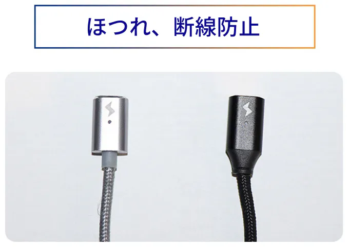 他のマグネットケーブルと違いは、マグネットコネクターのデザインです。両端(チップの端とケーブルヘッド)が凹形で斜めになっています。他の製品のデザインでは、きちんとケーブルと接続部分が配列されてなければ正しく接続することができません。しかも、マグネット強度の弱さも目立ちます。下の画像をご覧ください。どれが私たちの製品か、わかりますか?