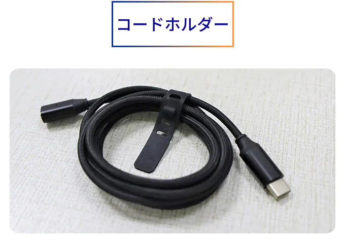 ケーブルにはコードホルダーも付いてきます。長さを短くしたり、きれいにまとめて収納や持ち運びにも便利です。