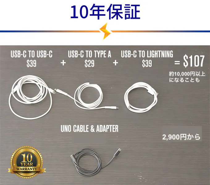 UNOケーブルは、他のケーブルを買い揃えるよりも、値段が5分の1。UNOケーブルの素材と製造工程によって、通常保証期間が1年の所、10年にまで伸ばすことができました。この先10年、スマホを買い換えても、ケーブルは保証付きです。