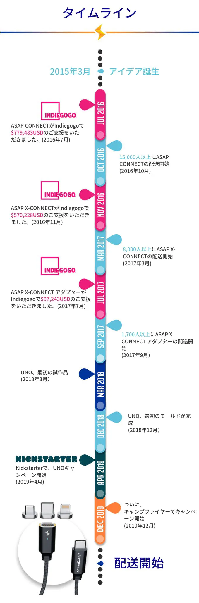 UNOケーブル、使ってみてください。UNOケーブルは、Chargeasapの最新イノベーション。最高の品質と便利さ、使いこごち、そして、見た目にもこだわりました。私たちは、「ユーザーの皆様がクリエーターでありイノベーターである」というモットーのもと活動しております。
