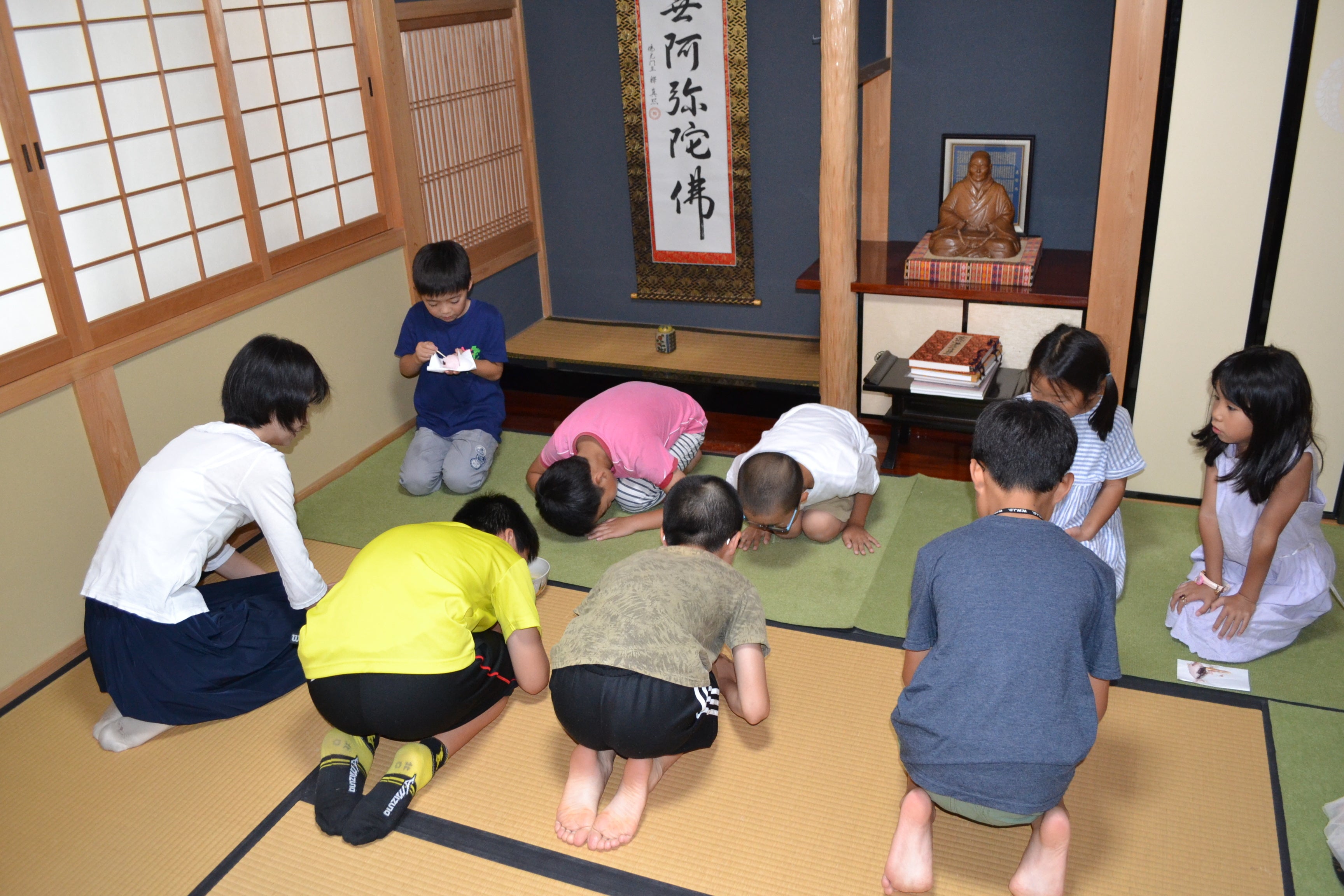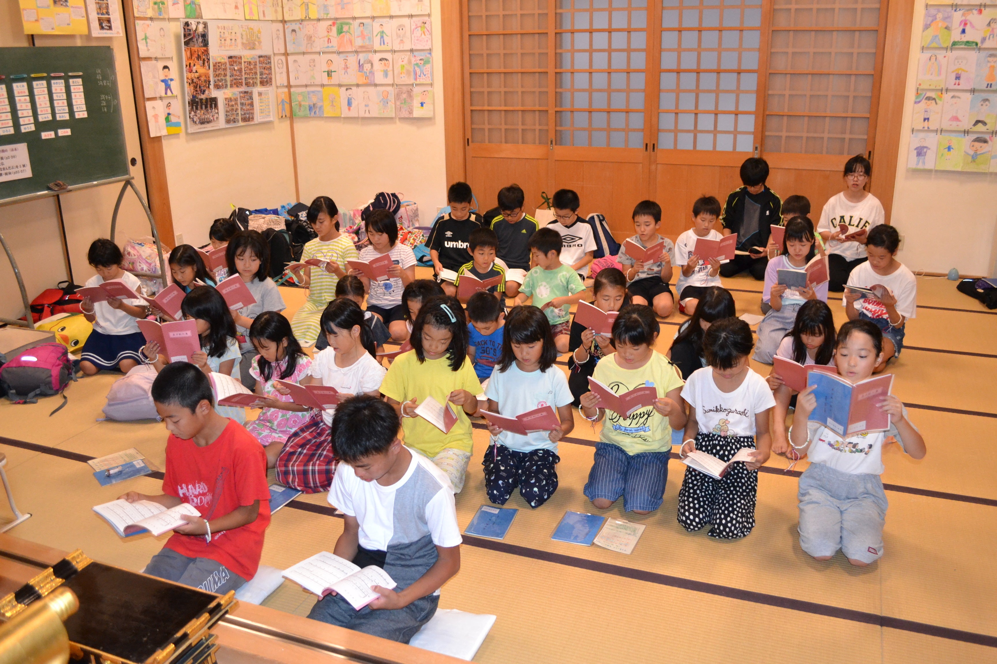 この「寺子屋くらぶ」では、お寺の本堂という仏さまがいらっしゃる空間のもと、学年を超えた友だちと、ともに学びともに遊び、おのずと手を合わせ、おのずと頭の下がるような温かなこころを子どもたちに育んでもらうことを目的としています。