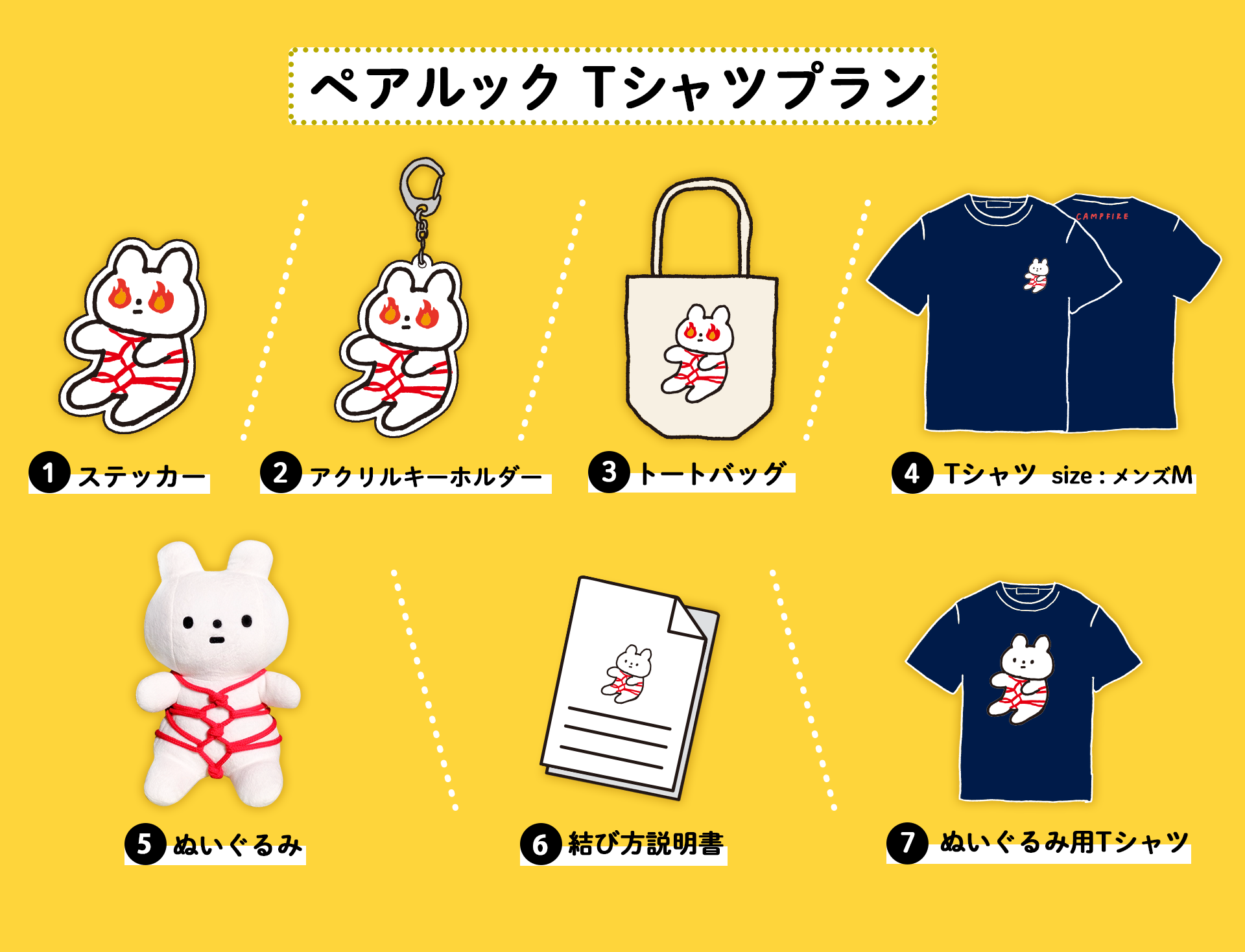 ①ステッカー ②アクリルキーホルダー ③トートバッグ ④Tシャツ ⑤きっこうちゃんぬいぐるみ ⑥結び方説明書 ⑦ぬいぐるみ用着せかえTシャツ