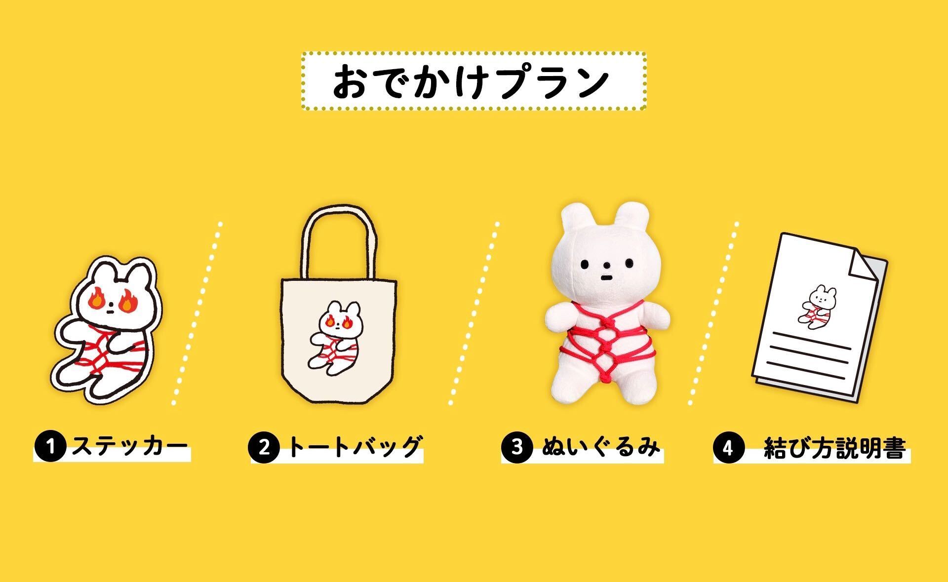 ①ステッカー ②トートバッグ ③きっこうちゃんぬいぐるみ ④結び方説明書