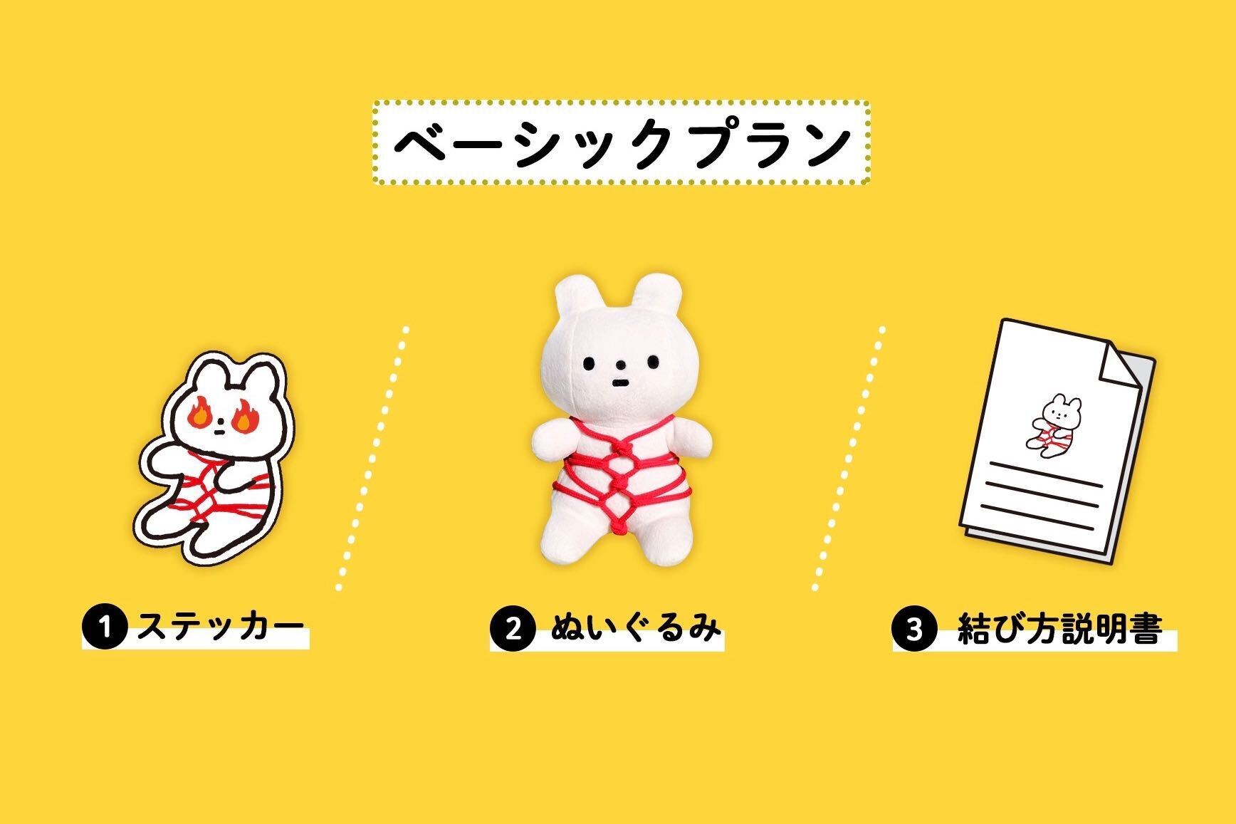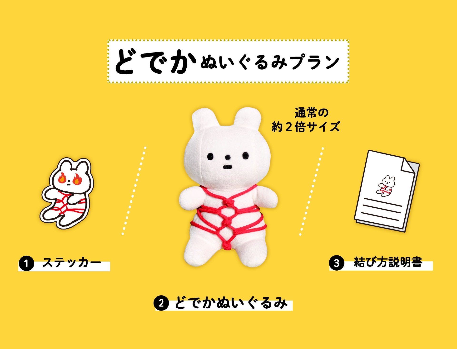 ①ステッカー ②どでかぬいぐるみ ③結び方説明書
