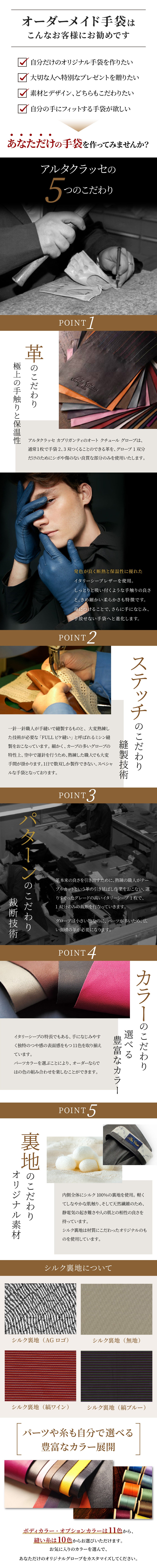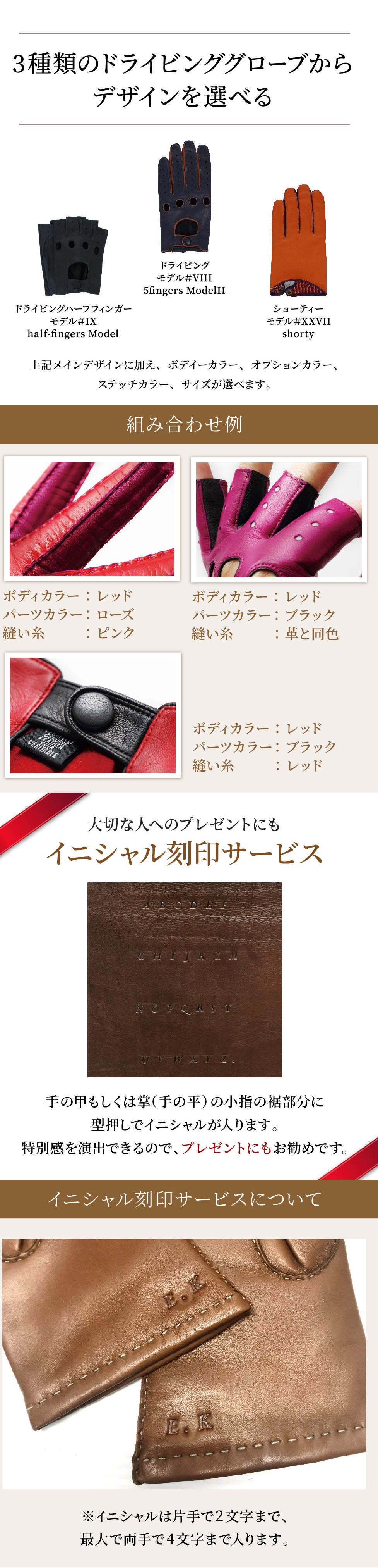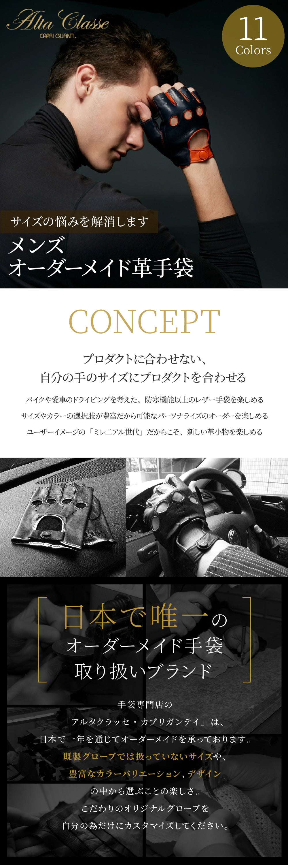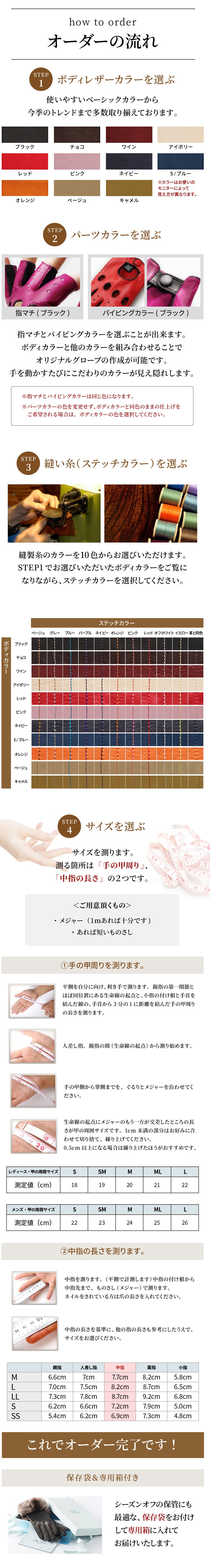 今までは既成のプレタポルテと制限のあるドライビング手袋のみネット販売してきましたが、通常モデルの5本指オーダーメイド手袋をお買い上げいただいたファンのお客様から、「ドライビング手袋も、この5本指の様にマチや掌側の色、パイピングの色を自由に選べないか?」とのお問い合わせを数多くいただいたのがきっかけです。