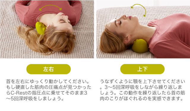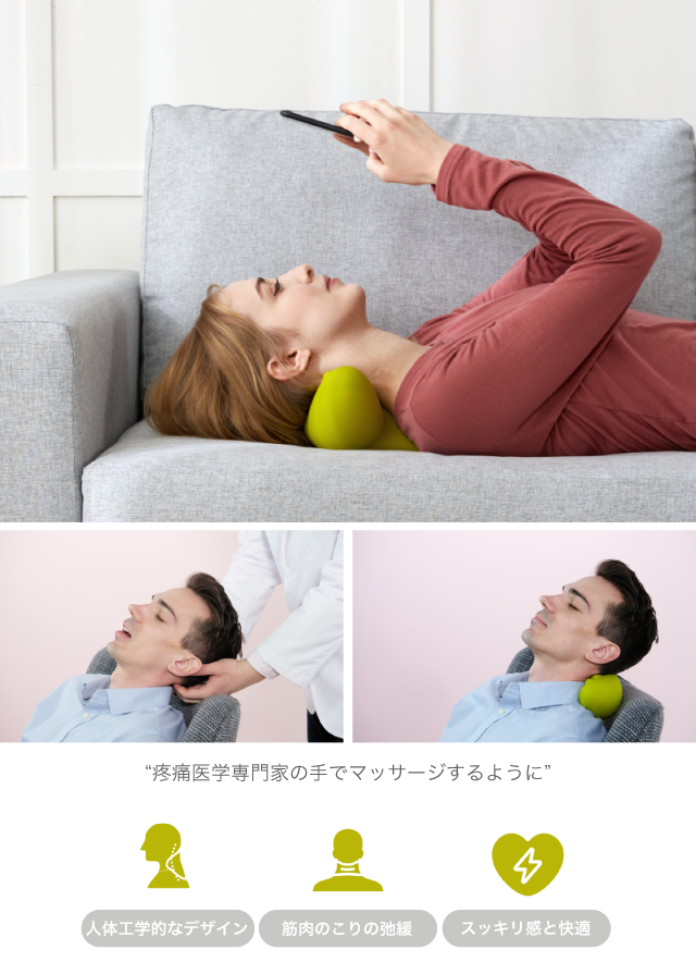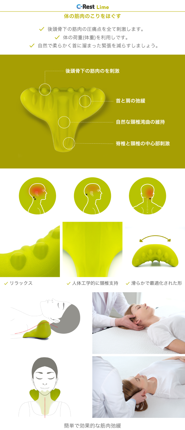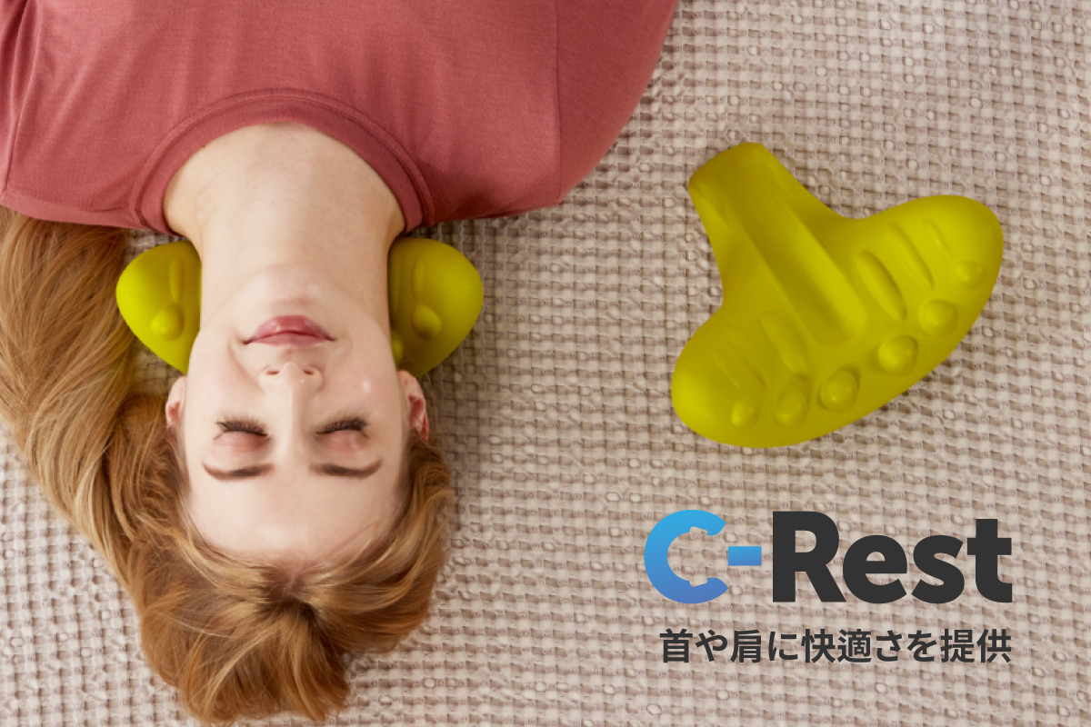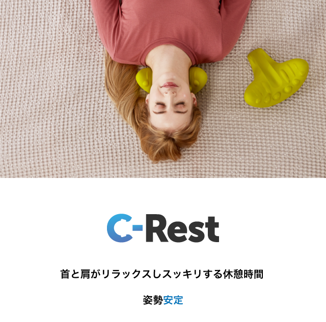 C-Restで自然に後頭部下の筋肉を刺激し頭部に流れる血行をよくし、首・背中・肩の筋肉のコリを緩和できるようにデザインしました。