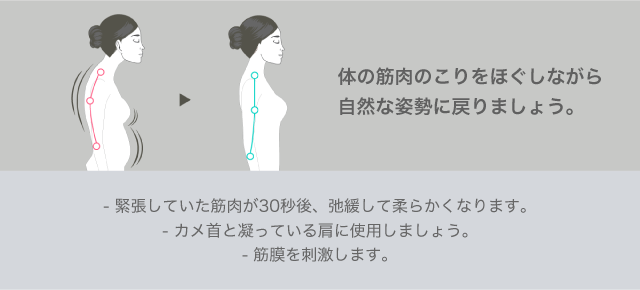 特に、首の筋肉を集中的に弛緩させ、たった10分で筋肉のこりを減らすことが期待できます。