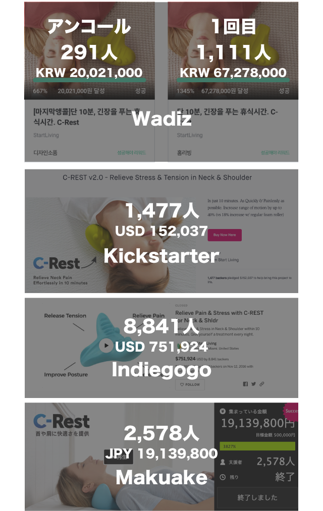 C-Restは海外でも、日本でも認められたプロジェクト!Kickstarter, Indiegogoで100万ドル以上、韓国のWadizで850万円以上、そして第1弾は日本のMakuakeで約2000万円を調達できました。プロジェクト完了後に商品をお受けになったサポーターの皆様より良いコメントも沢山頂きました。