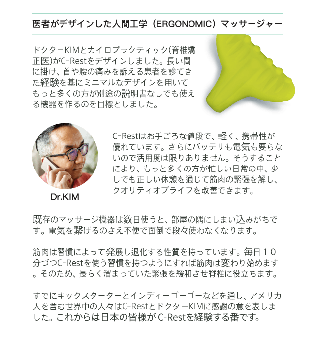 C-Restは現職の理学療法士と疼痛治療専門家がデザインし開発した特別で効率的なネックマッサージャーです。