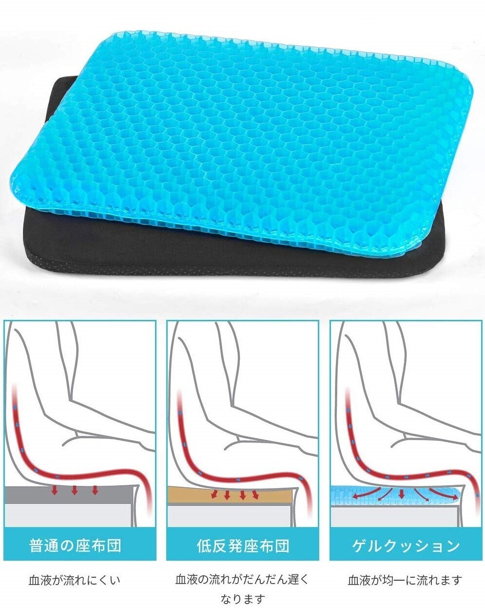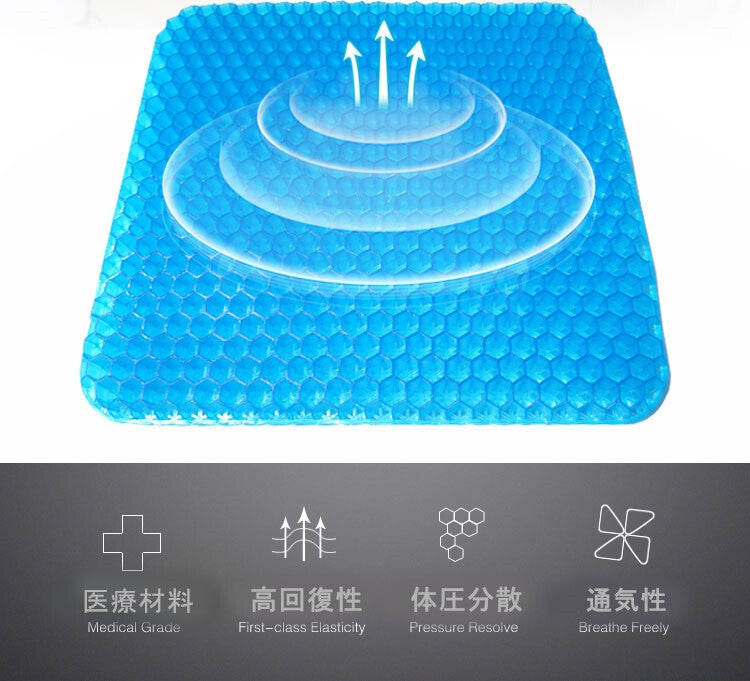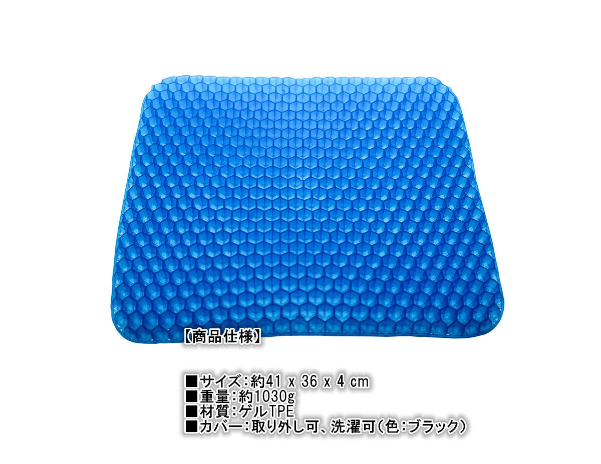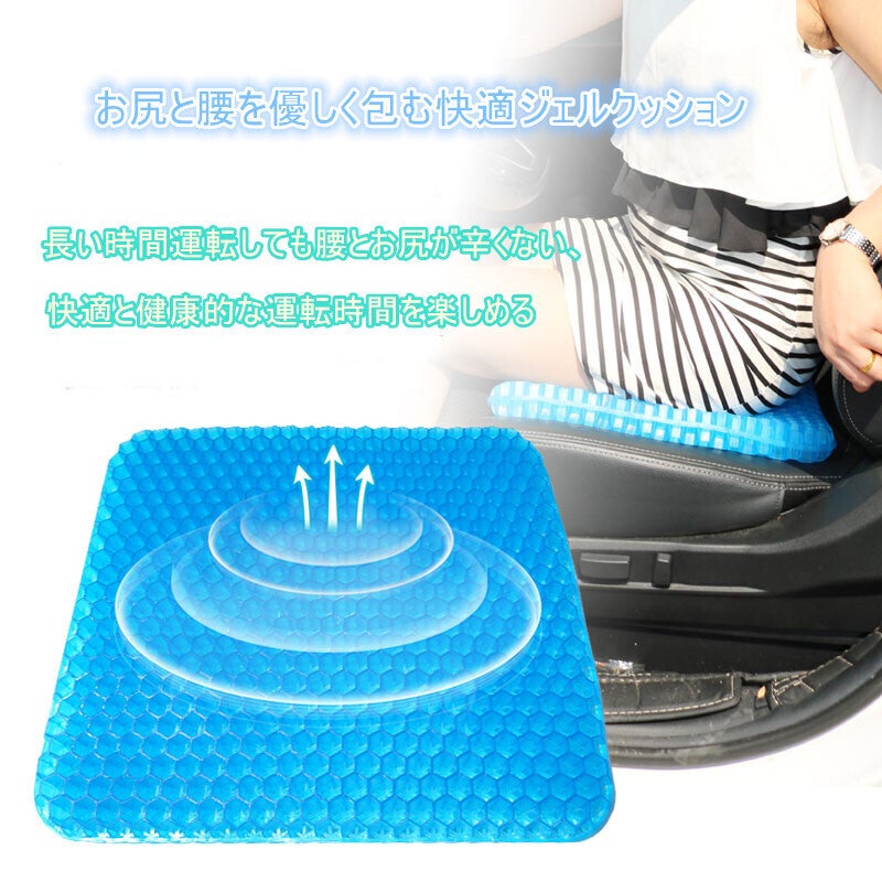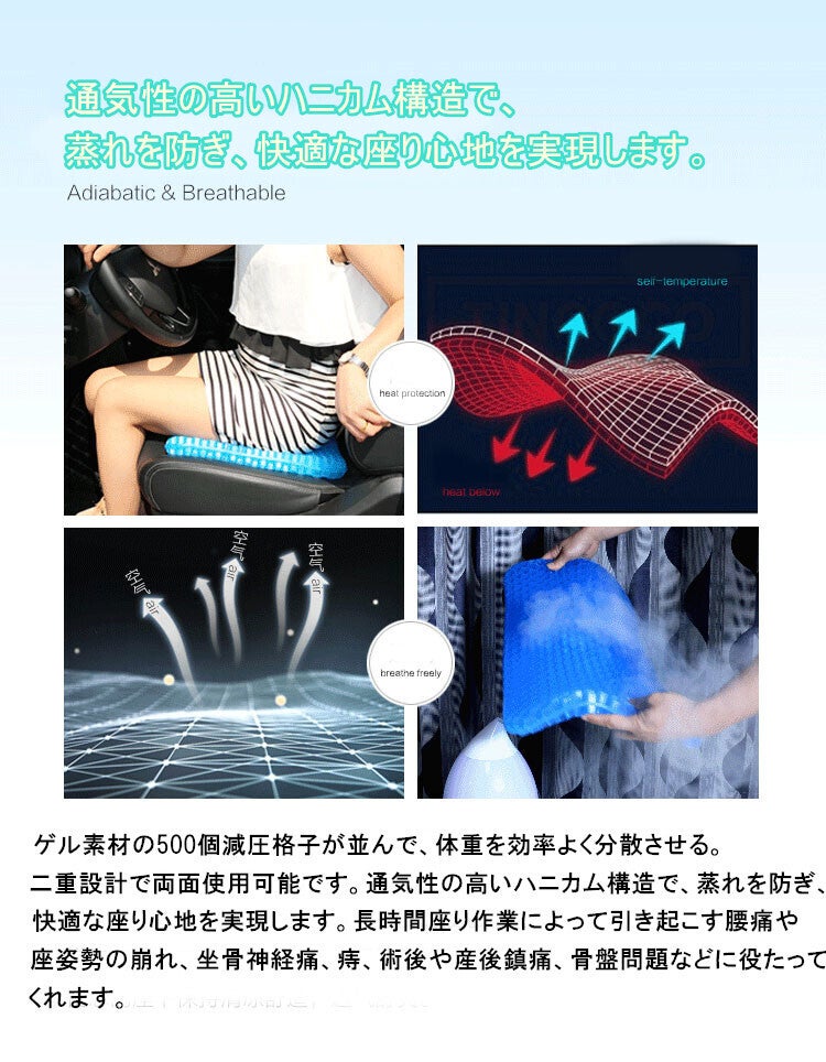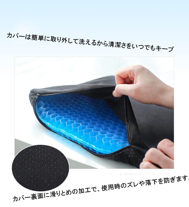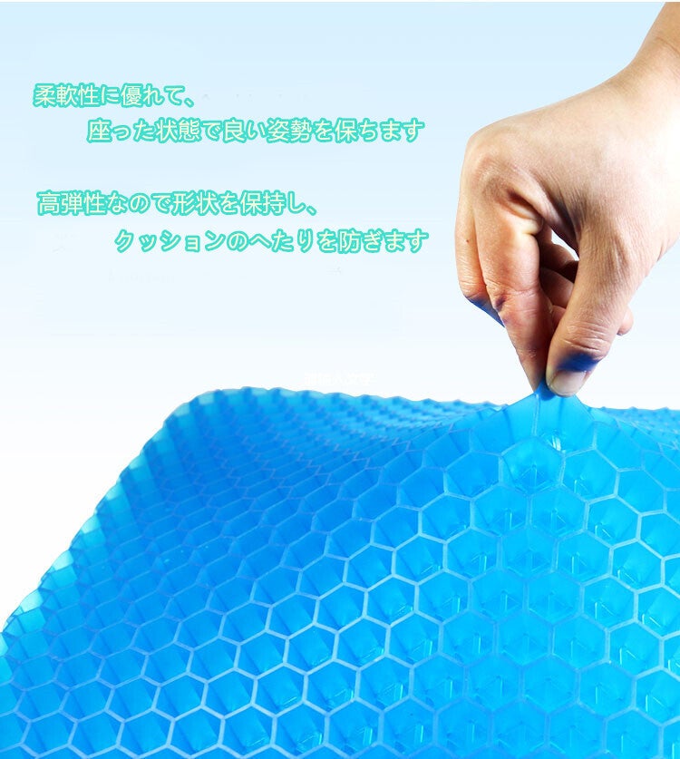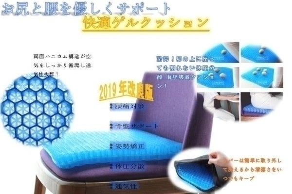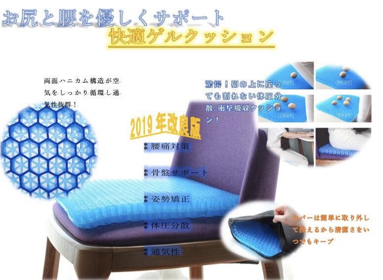 職場での使用に購入いたしました。最近デスクワークが多くなり長時間座りっぱなしになることが多くお尻が痛くなってどうしても集中力かけます。それまでは低反発のクッションを使用していました(東急ハンズとかで売っている中央に穴が開いたドーナツ型のまあまあ高価なやつ)がやはり長時間使用していると効果が薄れます。まだ使用して間もないですが低反発のクッションとは全然使用感が違いますし、座っていてもなんとなく気持ちがいい感覚です。第一印象はかなりよかったし、周りの方もジェルクッションに興味がある方も多くお試しで座りにきています。カバーにお滑り止めがついているためズレることなく快適に使用できます。今からは冬ですが低反発クッションは夏場はお尻が蒸れていましたが、ハニカム構造になっているため夏場にも快適に使えそうな予感です。母親も椅子に座っていると腰が痛いと常々言っているので買ってあげようと思います。