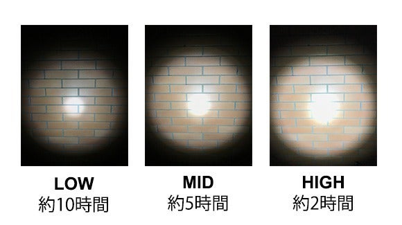 照射モード:LOW(弱)、MID(中)、HIGH(高)、SOS(点滅)
