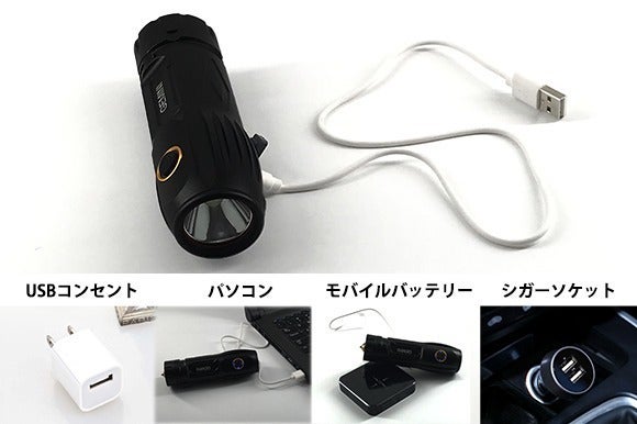 シガーソケット、パソコン、USB充電器、モバイルバッテリー、コンセントなどで、いつでもどこでも充電可能。