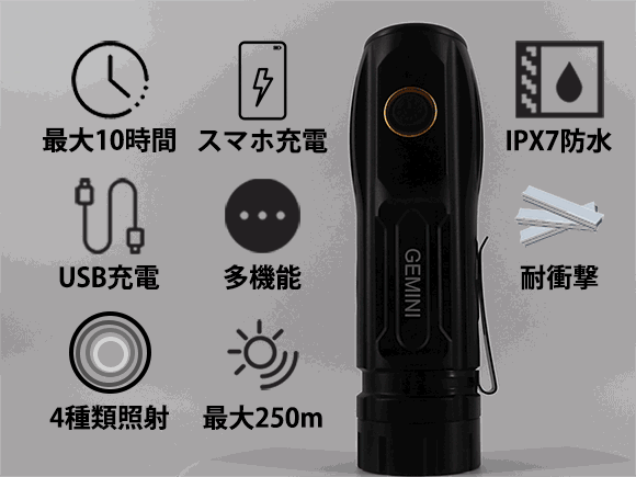 XHP50は世界で最大のプロ級懐中電灯メーカー、アメリカのCREE社が生産したLEDライトです。GEMINI LIGHTは最大出力30W、二代目の四コアXHP50LEDライトを採用し、最大照射距離が250メートルを実現しました。