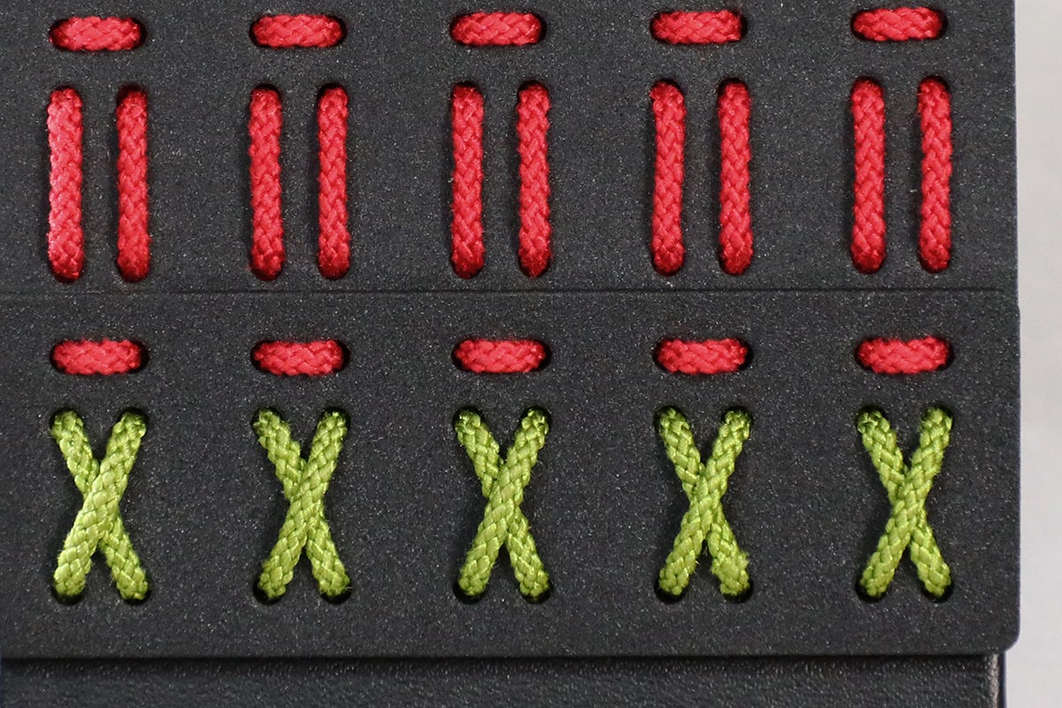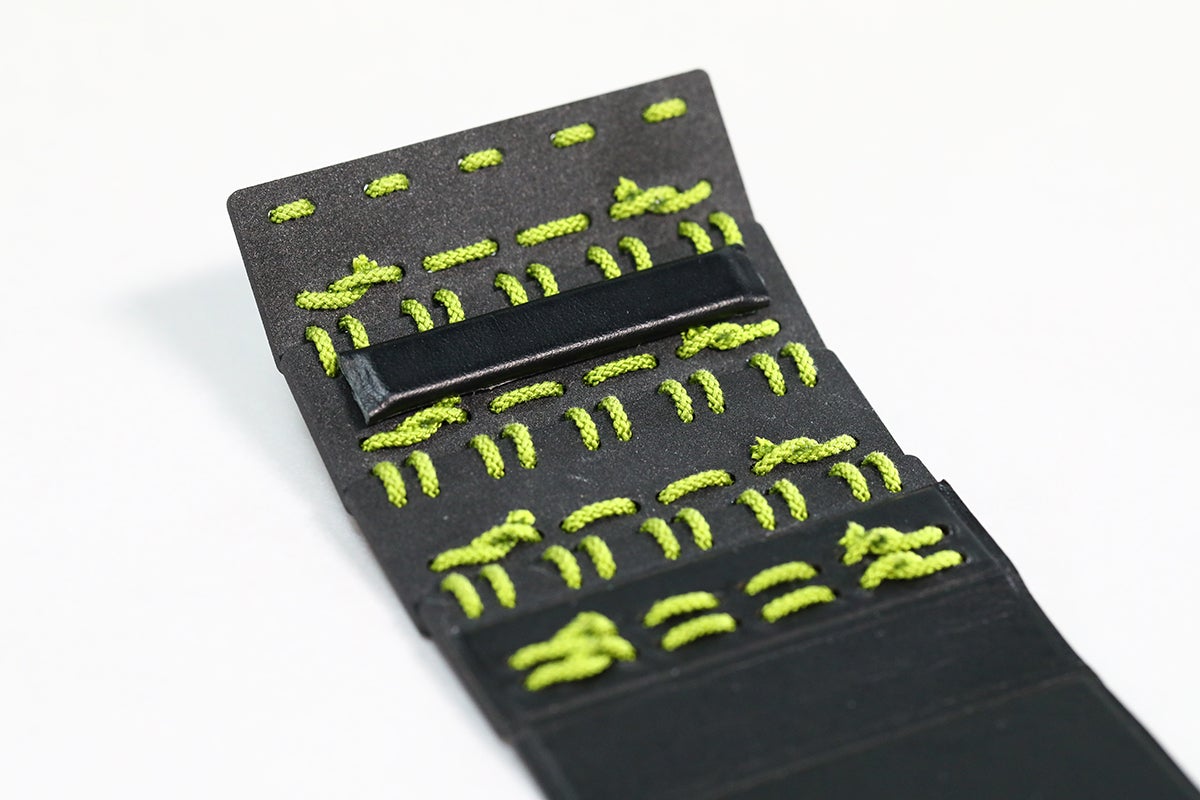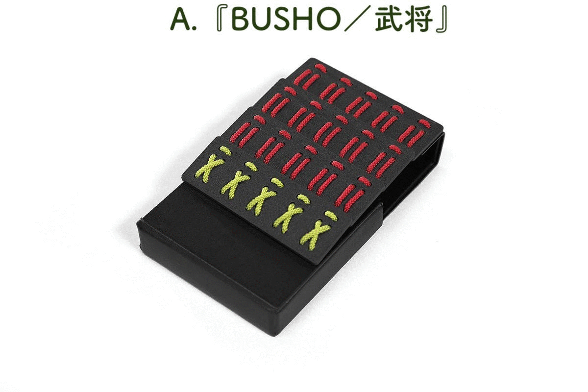 その紐でつなぐ技術を「縅(おどし)」と言うのですが、本製品ではフラップ部分にその縅の技術が使われており、手軽に携帯できる名刺入れにすることで、擬似的に「甲冑を身に着ける」ような感覚が味わえます。