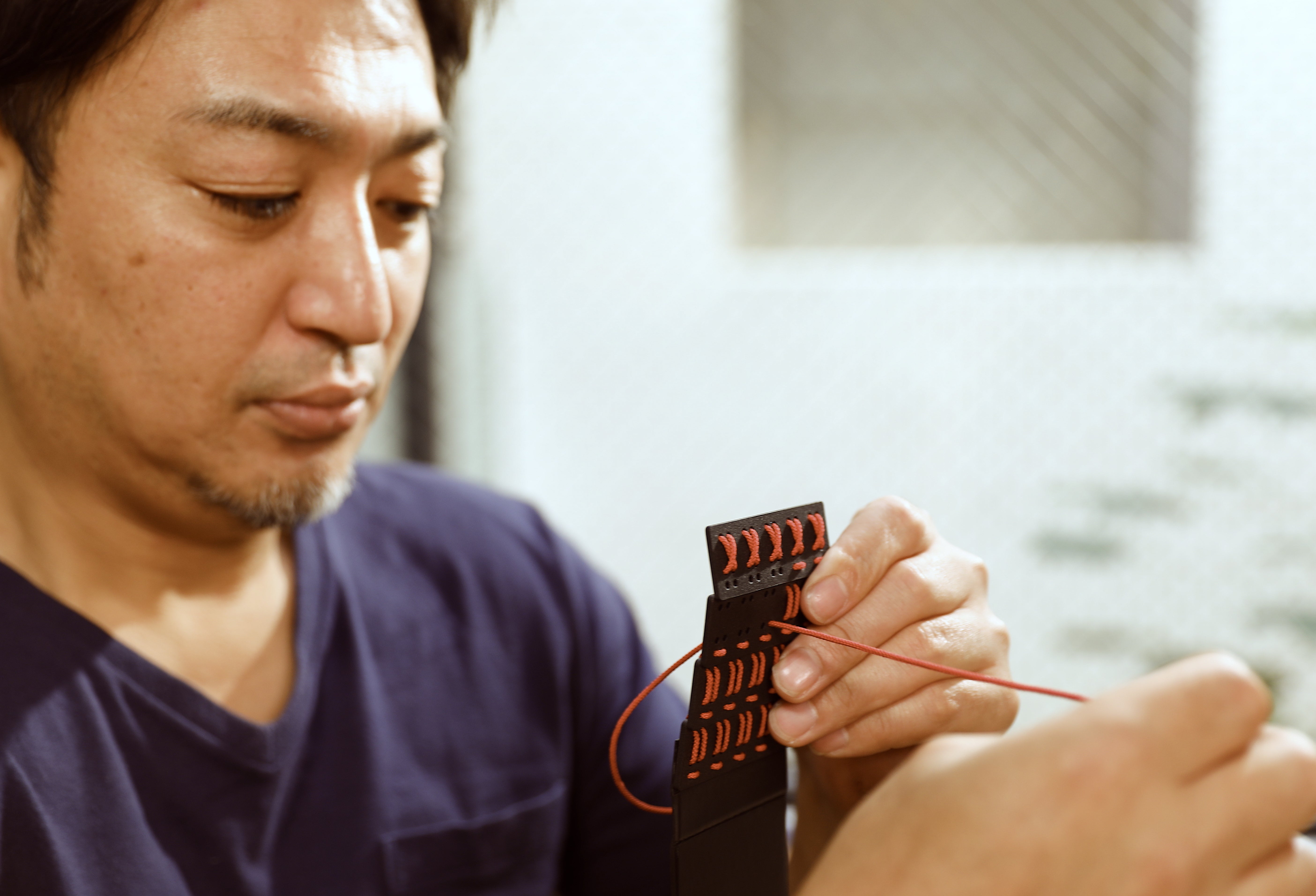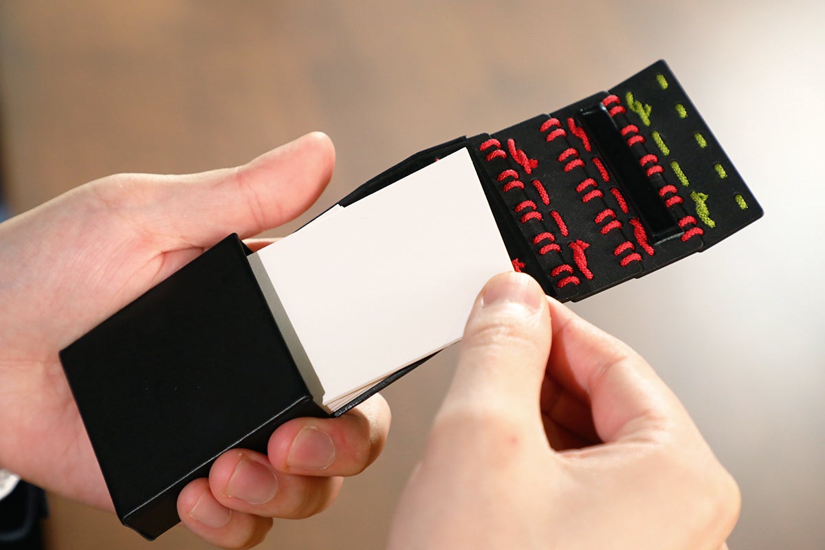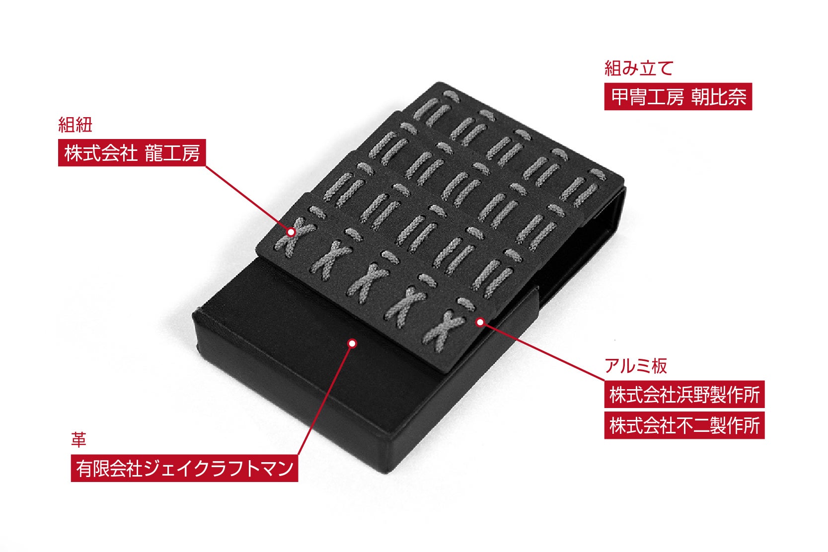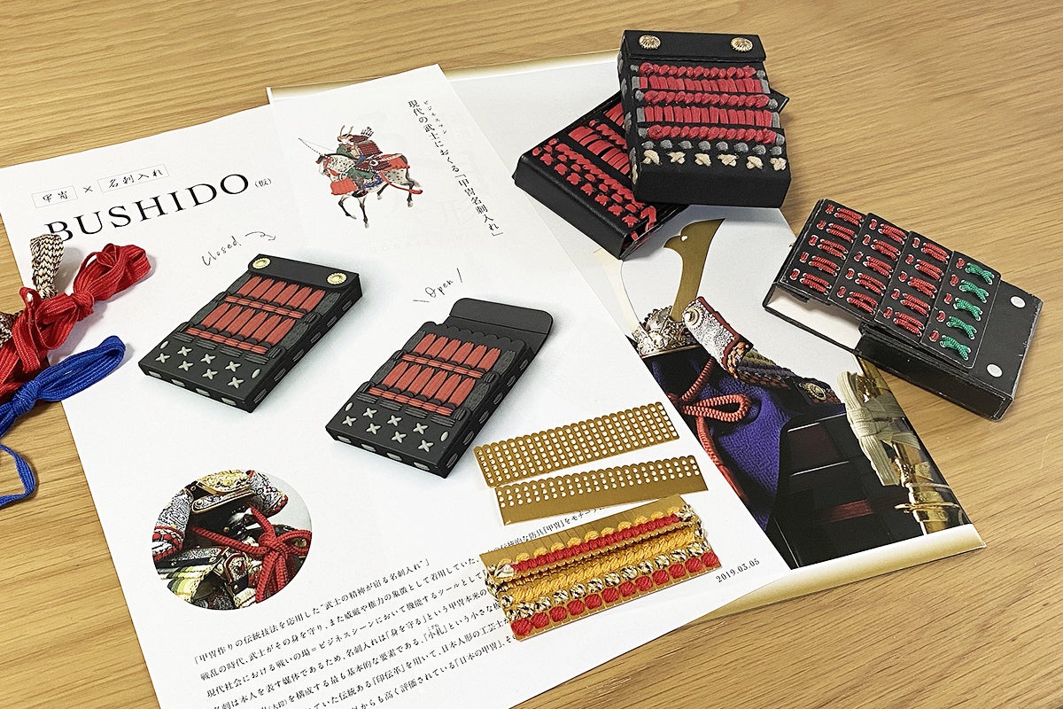 本製品は、フラップ部分が小札(こざね)になっており、小札をつなぐ「縅(おどし)」の技術により、名刺の形に合わせて作られています。戦国時代にも使われていた革をベースに、軽くて丈夫なアルミ板と、色彩豊かな組紐を合わせることで、現代のビジネスシーンにも合い、その中でも映えるデザインとしました。