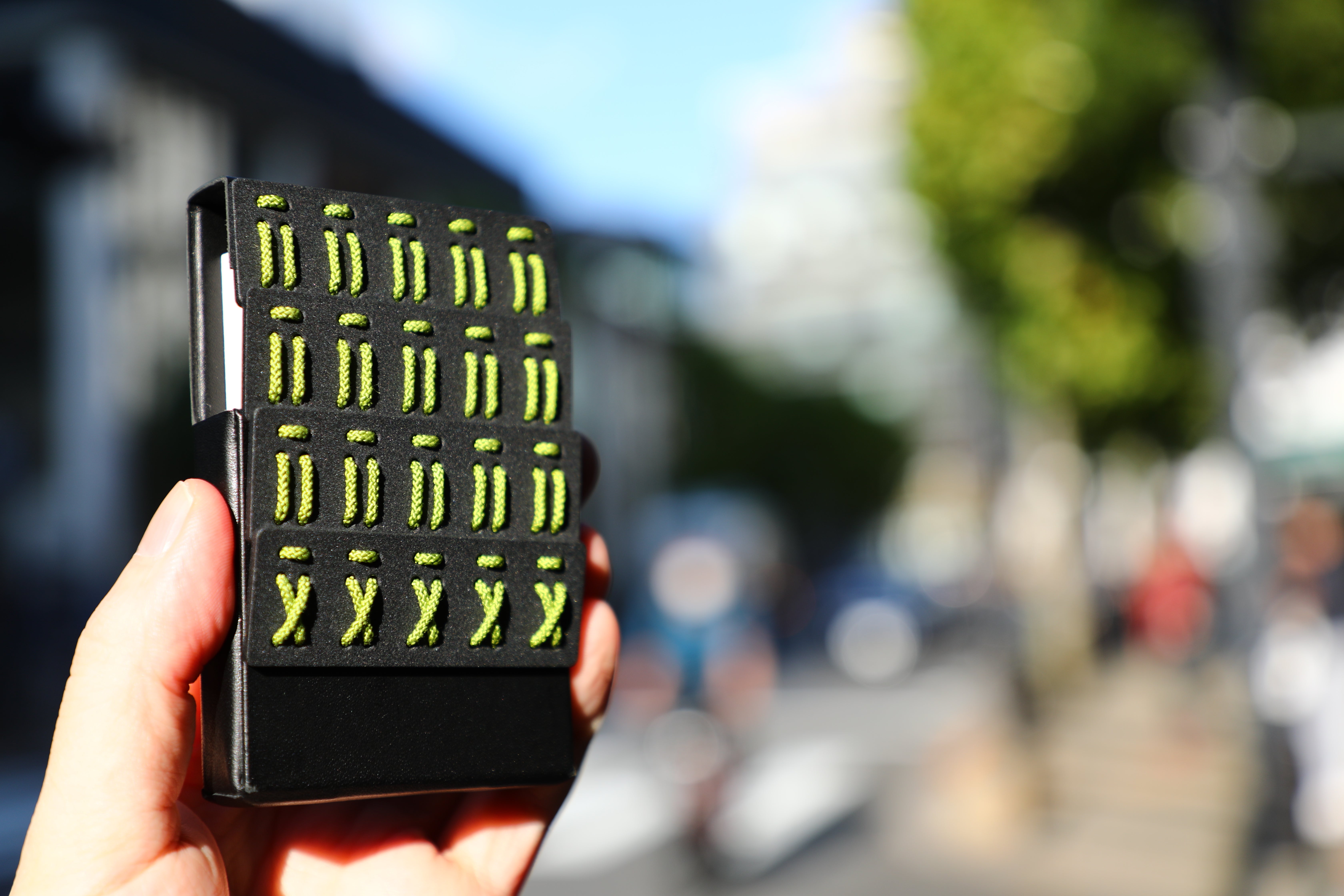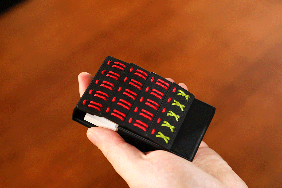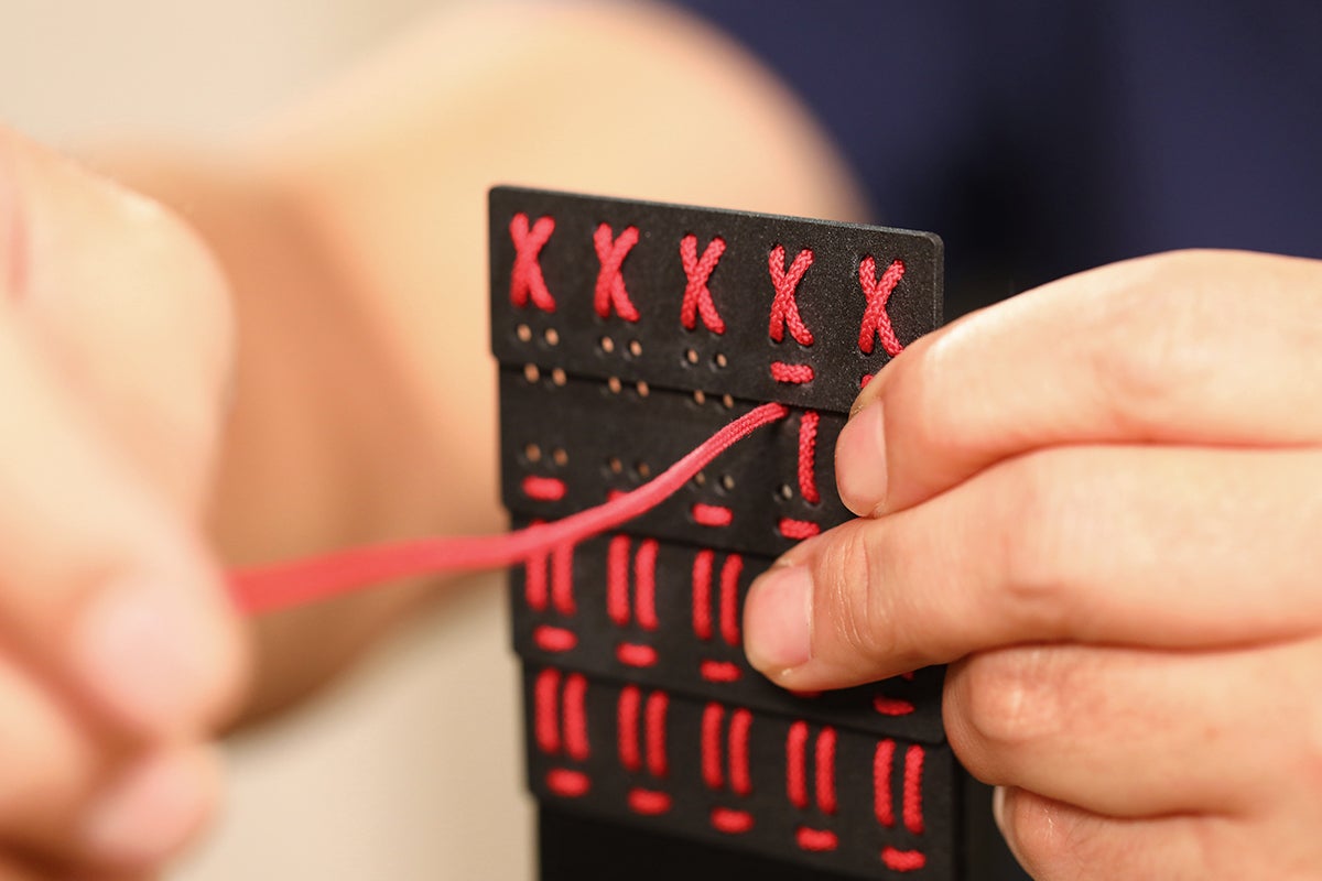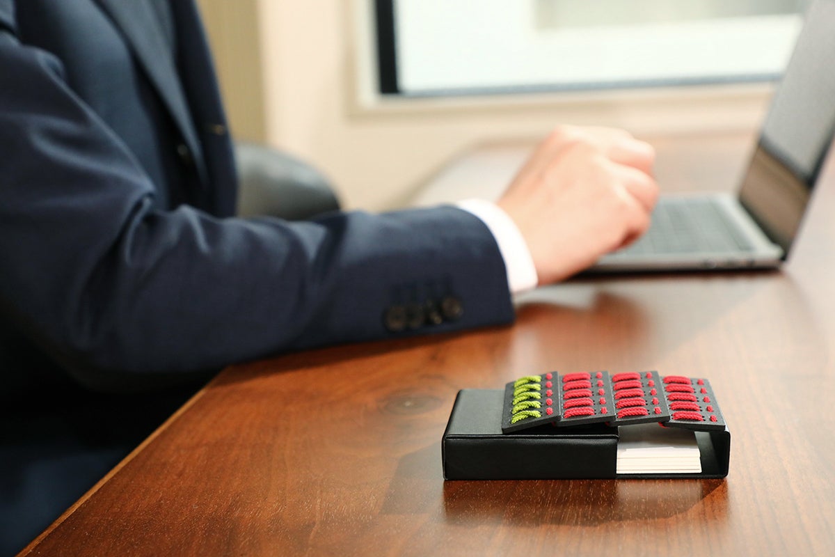 本製品は、フラップ部分が小札(こざね)になっており、小札をつなぐ「縅(おどし)」の技術により、名刺の形に合わせて作られています。戦国時代にも使われていた革をベースに、軽くて丈夫なアルミ板と、色彩豊かな組紐を合わせることで、現代のビジネスシーンにも合い、その中でも映えるデザインとしました。