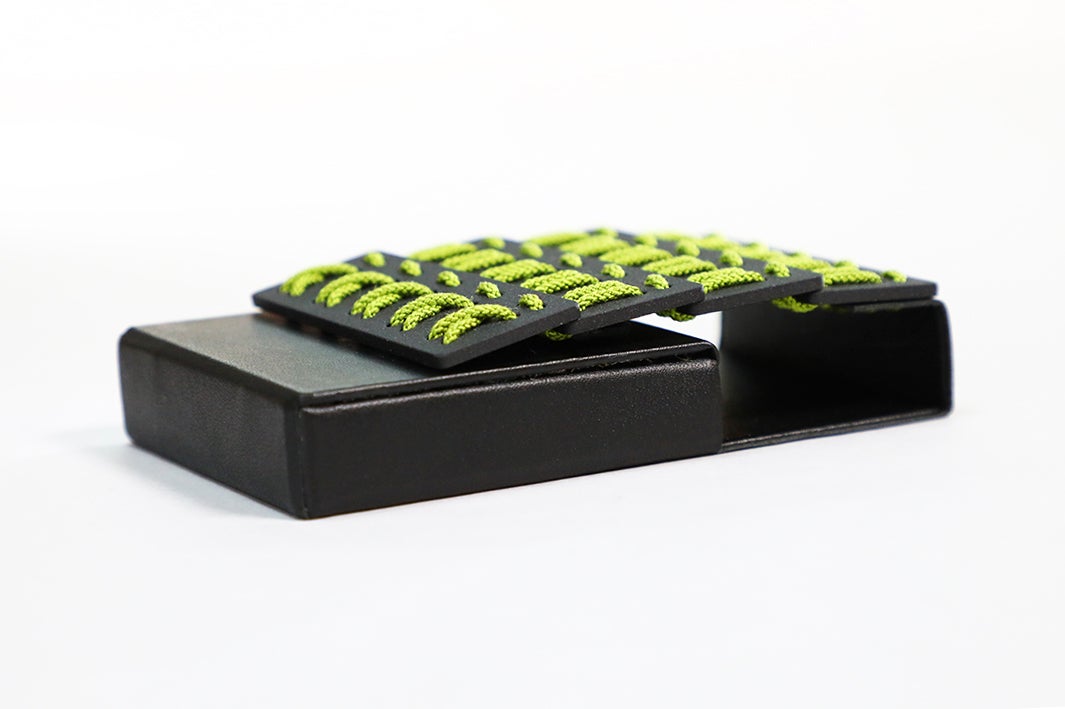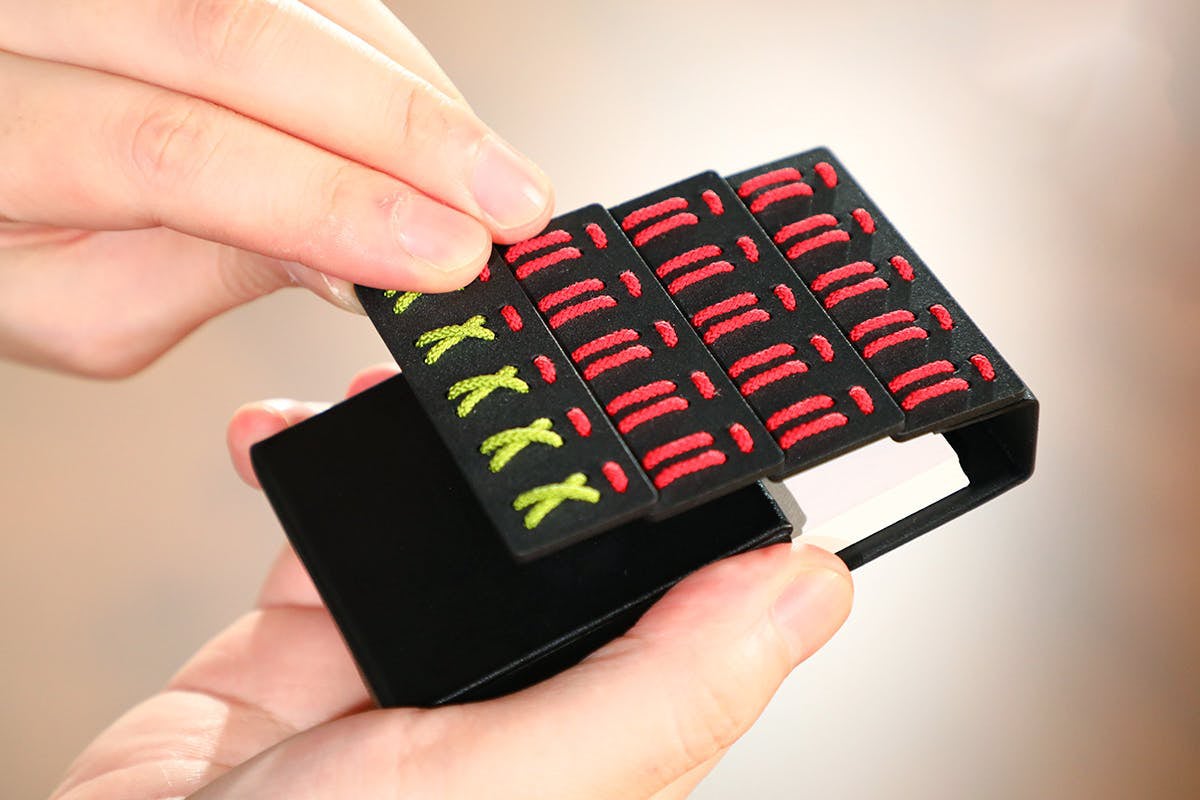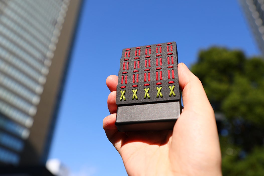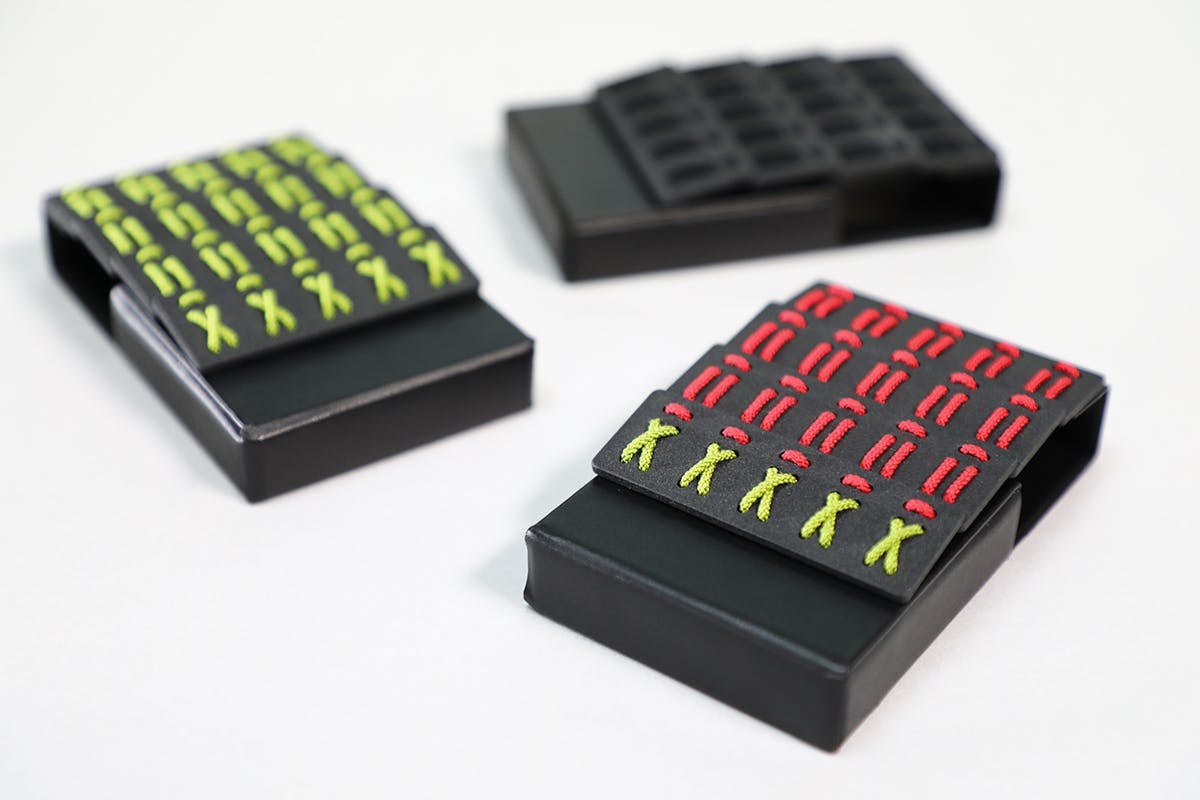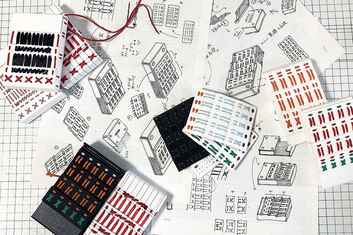 本製品は、フラップ部分が小札(こざね)になっており、小札をつなぐ「縅(おどし)」の技術により、名刺の形に合わせて作られています。戦国時代にも使われていた革をベースに、軽くて丈夫なアルミ板と、色彩豊かな組紐を合わせることで、現代のビジネスシーンにも合い、その中でも映えるデザインとしました。