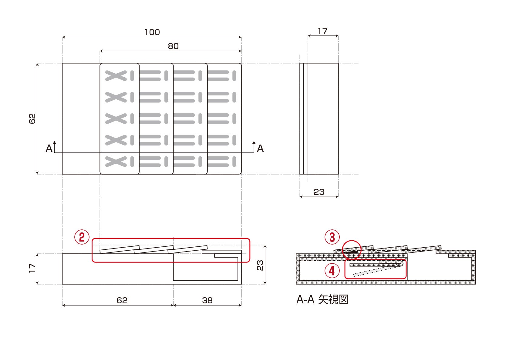 ②金属プレートは縦方向に4枚折り重なるように配置されています。