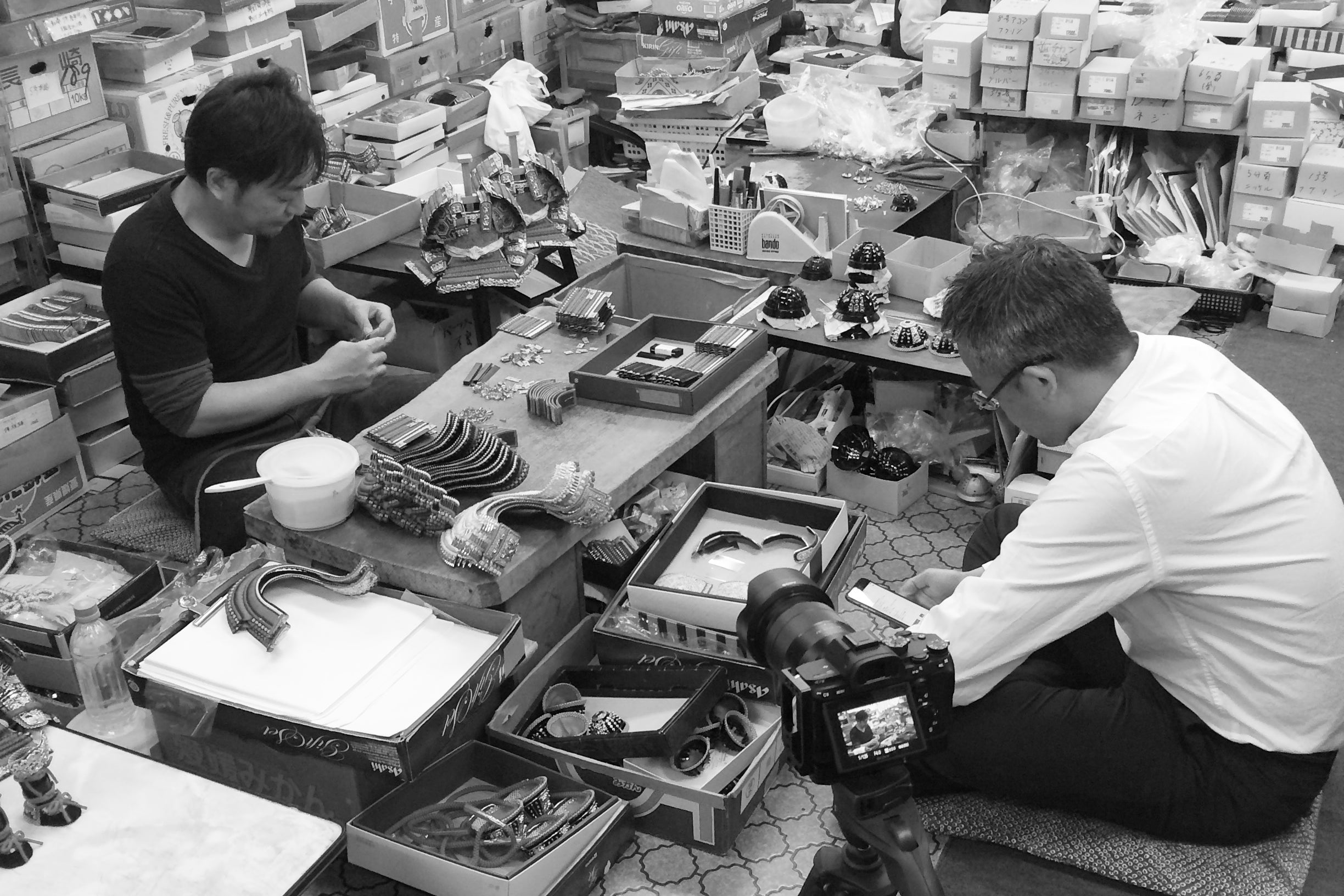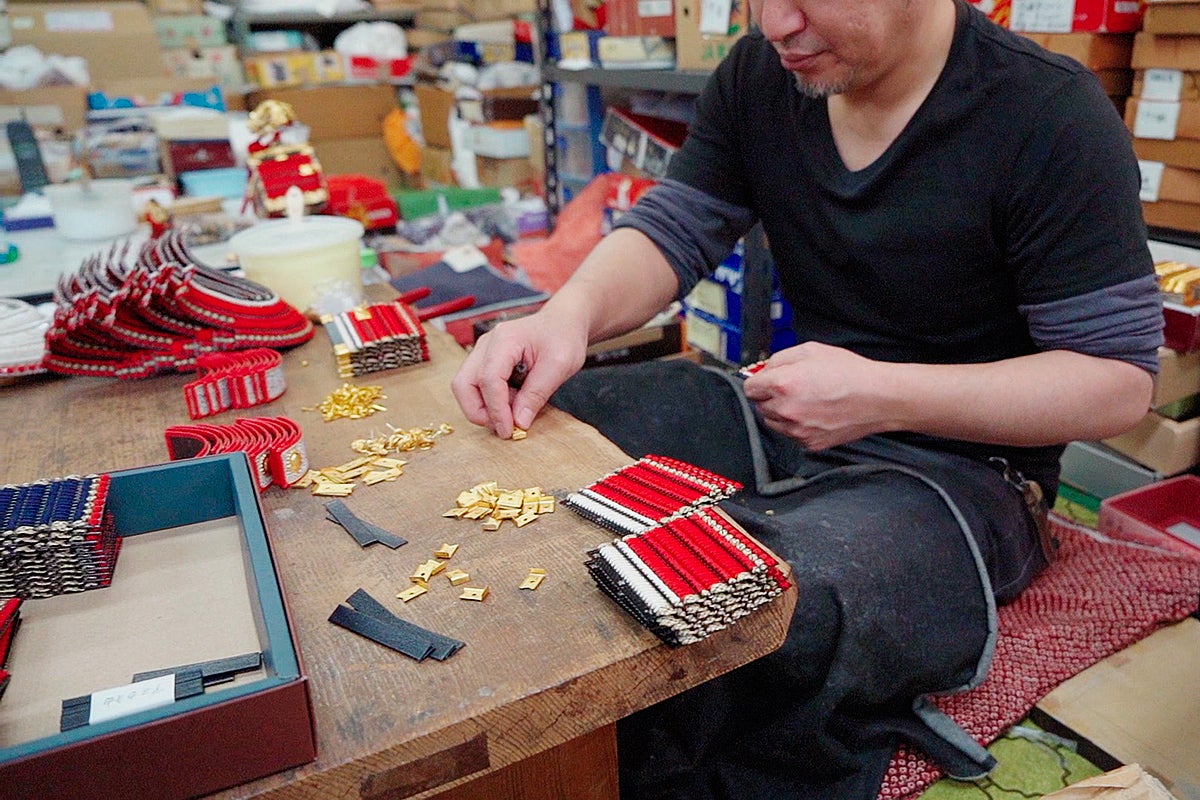 本製品は、日本の伝統的な防具「甲冑」をモチーフに、現代における戦いの場=ビジネスシーンにおいて機能するツールを、節句人形の製造で有名な埼玉県越谷市の職人朝比奈さんが「名刺入れ」に仕立てました。(写真は節句人形製作中)