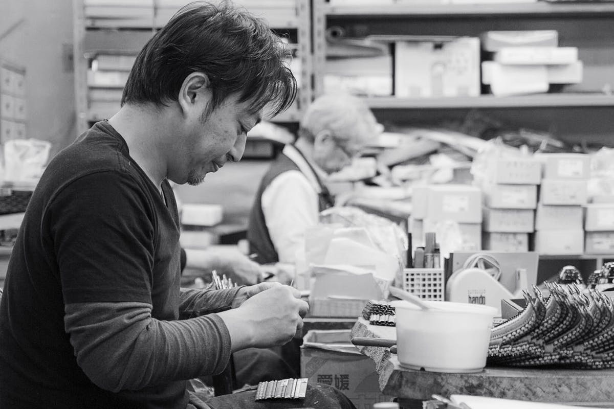 革の組み立てから、金属プレートの取り付けまで、すべて手作業で行っています。